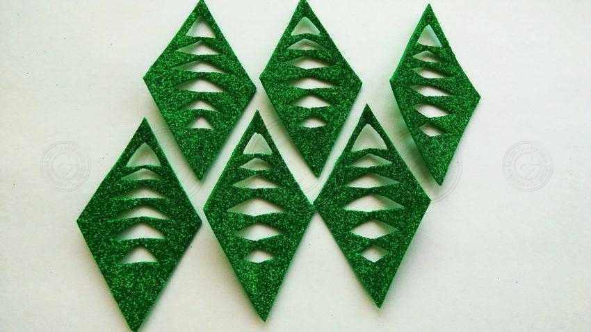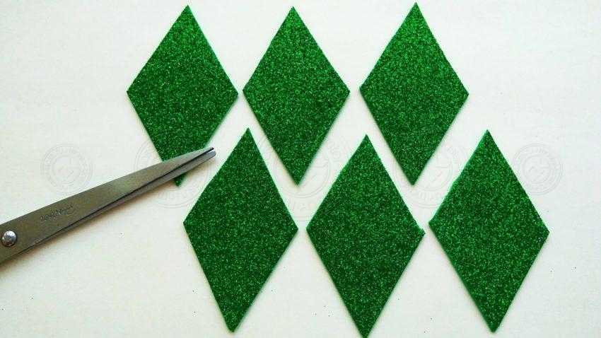 1. Подготовьте зеленый фоамиран, из которого будут выполнены лучики снежинки. Из картона вырежьте ромб и 2 противоположных угла в нем сделайте в 60 градусов. 2. Перенесите подготовленный шаблон на фоамиран. Сделайте это с обратной стороны, чтобы было видно линии, и с помощью зубочистки. Далее вырежьте 6 одинаковых ромбов. 1 пара углов у них должна равняться 60 градусов. Если это будет так, в дальнейшем все они без просветов или лишнего наслоения поместятся на окружности.
