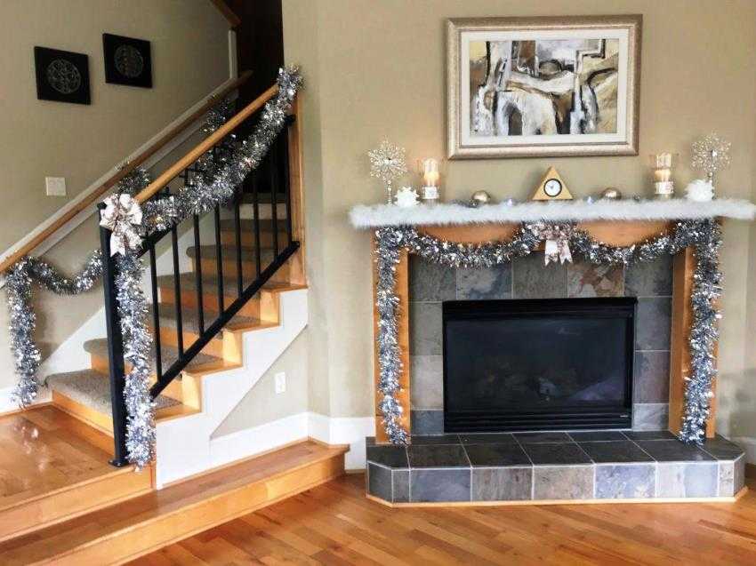 Самый распространенный способ, как украсить перила лестницы – это веточки хвои. Закрепите их по всей длине перил, используя проволоку, широкие нити или ленты. Если это искусственные ветки или дождик, имитирующий елочку, достаточно обвязать их вокруг верха.