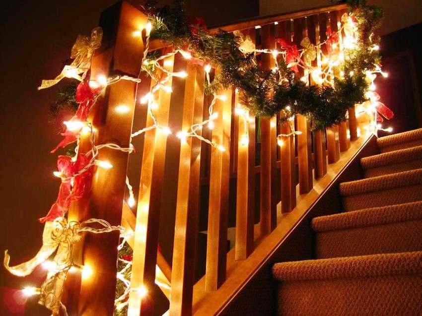 Праздничность лестнице придадут любые источники света. Так что запасайтесь гирляндами: их понадобится много, если вы собираетесь украсить парадную лестницу. Первый способ украшения – обмотать гирляндами все перила и перекладины.