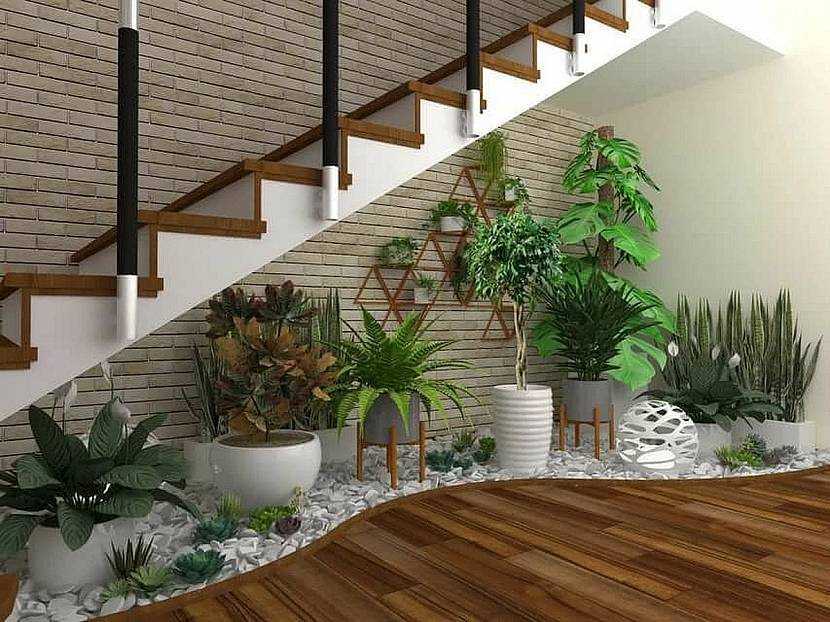 Участок можно отдать кактусам и суккулентам. Для содержания тропических растений пространство под лестницей застекляют и создают специальный микроклимат. Компактный зимний сад станет ярким элементом интерьера. В дизайн отлично впишется миниатюрный фонтан.