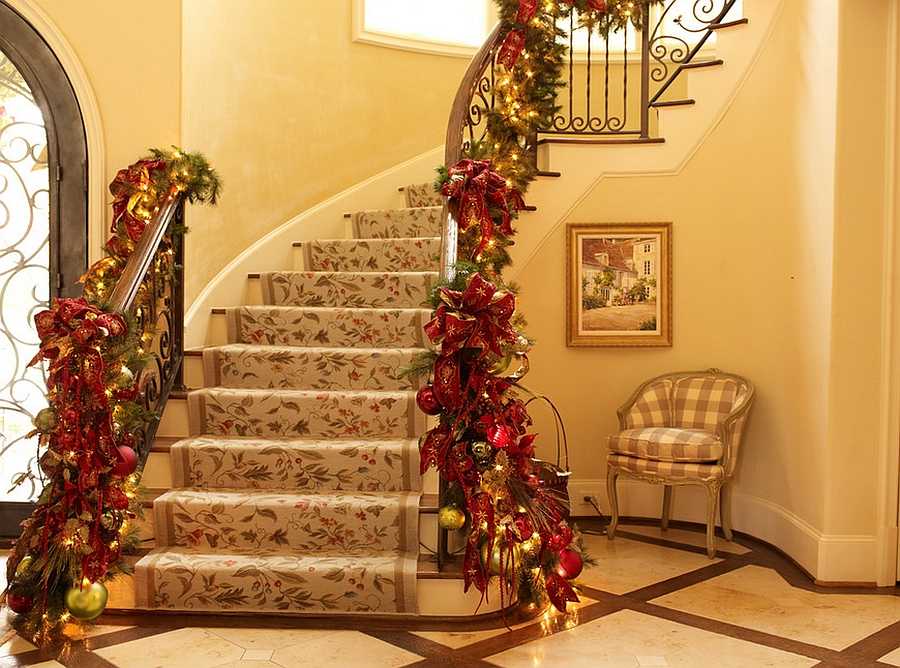 Прежде всего необходимо определиться с общим стилем вашего жилища и продумать, как украшения лестницы будут сочетаться с тематикой праздничного декора вашего дома.