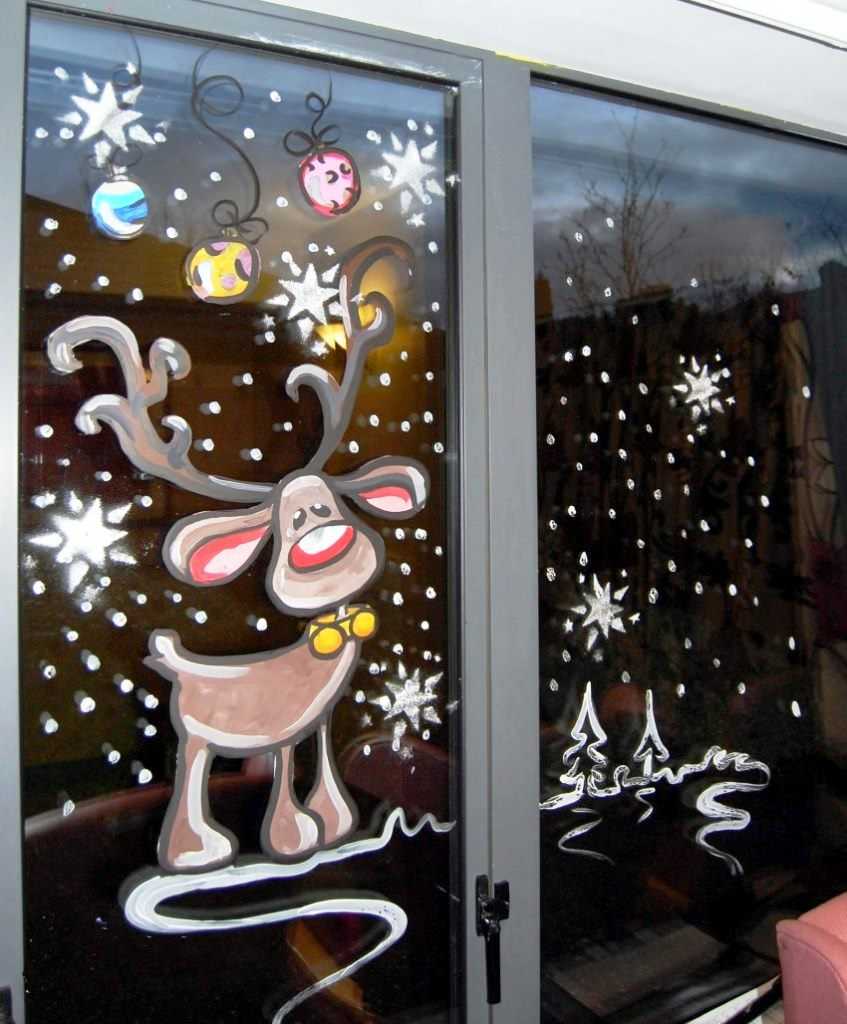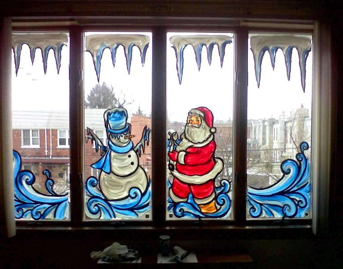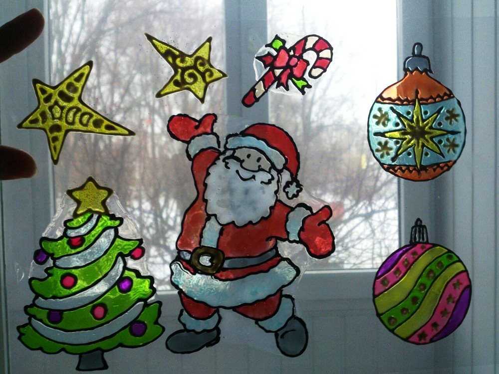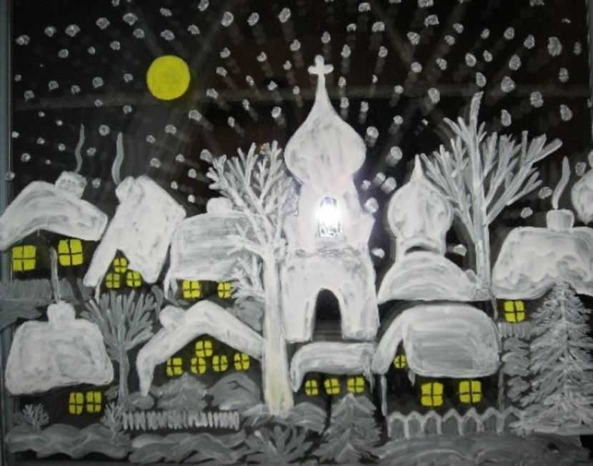 Зимой нередко можно увидеть на стекле узоры, нарисованные морозом. Они притягивают взгляд загадочными переплетениями линий. Также и вы можете сделать самостоятельно удивительные рисунки. Для этого используется трафарет, специальные краски, сахарная пудра, искусственный снег из баллона либо обычная зубная паста. Идеи картинок подскажет фантазия: снежок, падающий на деревья и дома, отпечатки ладошек членов семьи, Дед Мороз со Снеговичком, лесные зверята. Интересно смотрится гармоничное сочетание рисунков и бумажных поделок.
