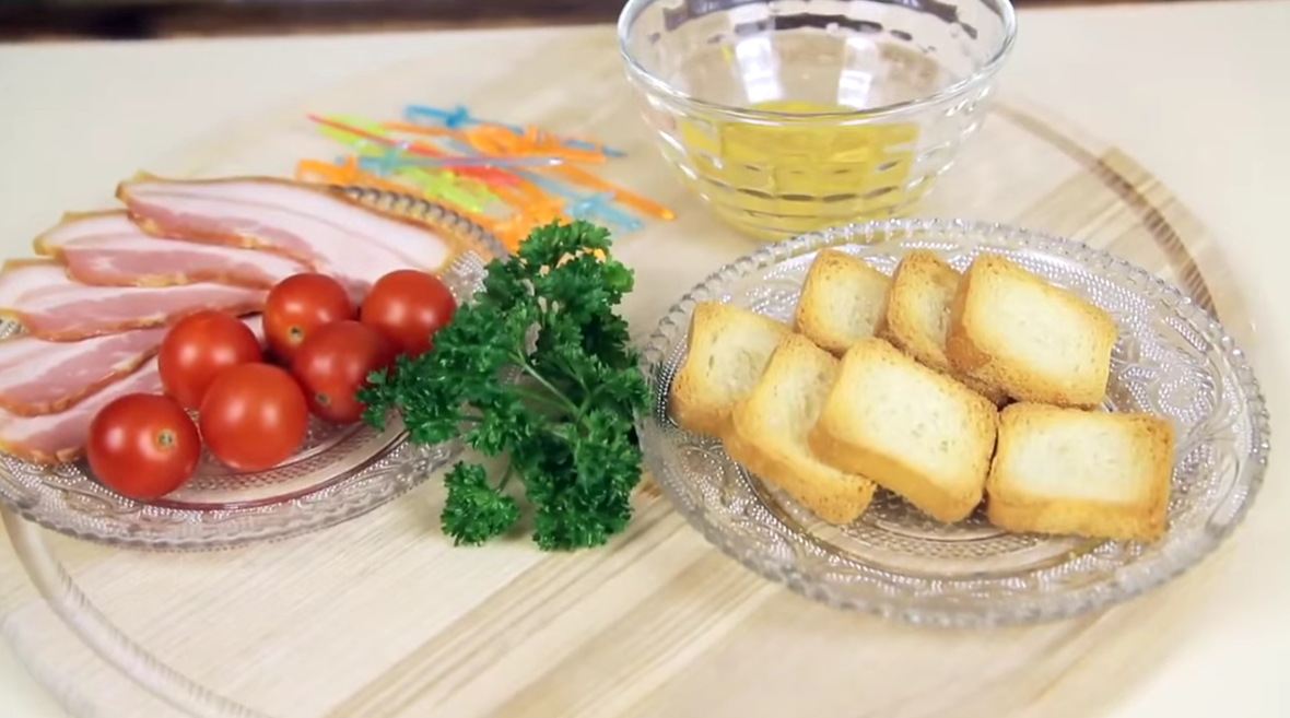 Эту заготовку на шпажках присоедините к гренке с помидором.