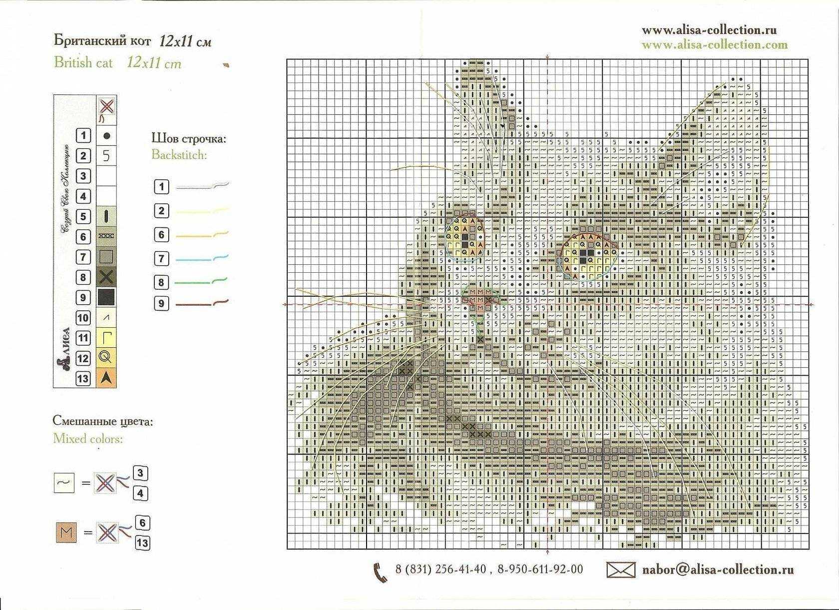 Вышивка с котиками популярна не только в мультяшном стиле. Если есть желание поработать над реализмом — рекомендуется найти схему с британским котом. Они выглядят благородно и в то же время мило. В основном используется серый цвет, сложности возникают при переходах между несколькими практически идентичными тонами. Глаза и контуры часто делают серебряными нитками, это придает практически однотонной картине яркости и четкости.