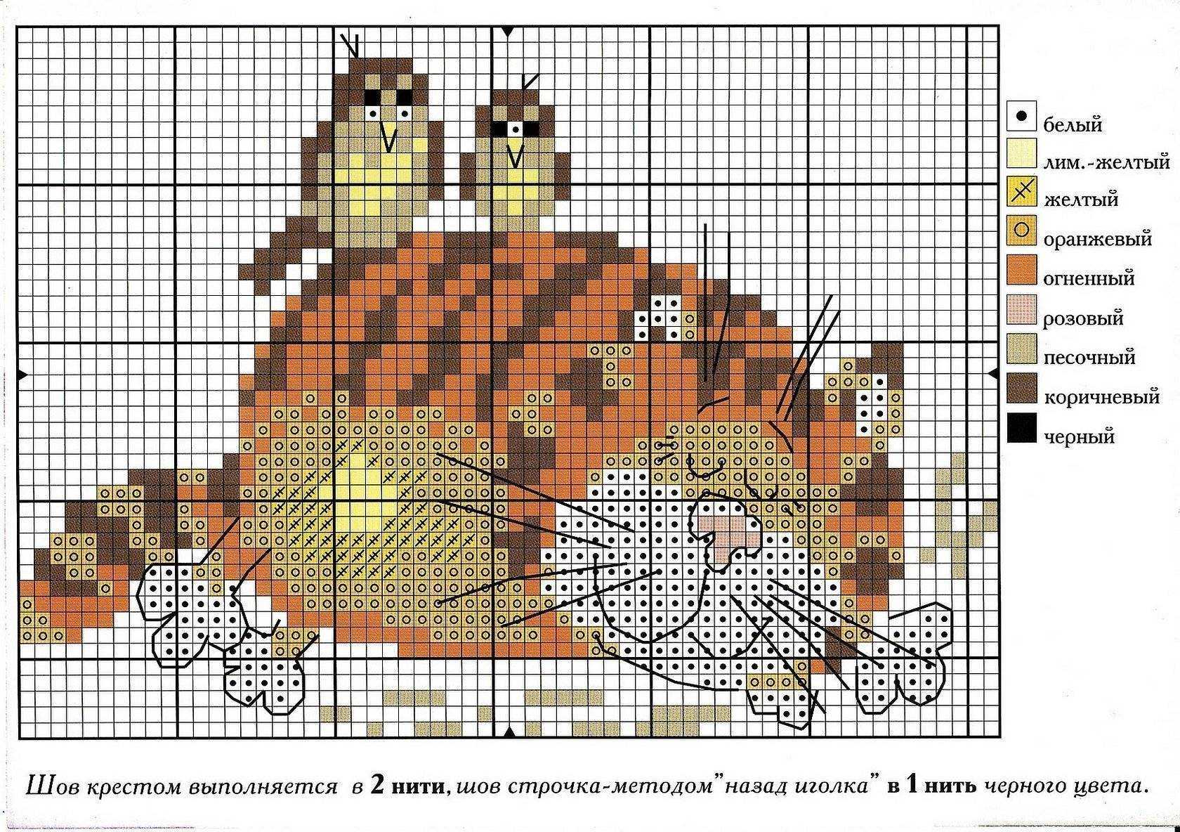 Вышивка котов по мультяшной схеме — хороший подарок ребенку. Изображение животного из мультика хорошо дополнит детскую комнату. Если картинка будет яркой — малышу будет интересно наблюдать. Так как эти звери помогают улучшить сон и успокоить — это хороший вариант для расположения над кроватью. Рекомендуется попробовать найти схему от Маргарет Шерри. Популярны схемы кота с гармошкой.