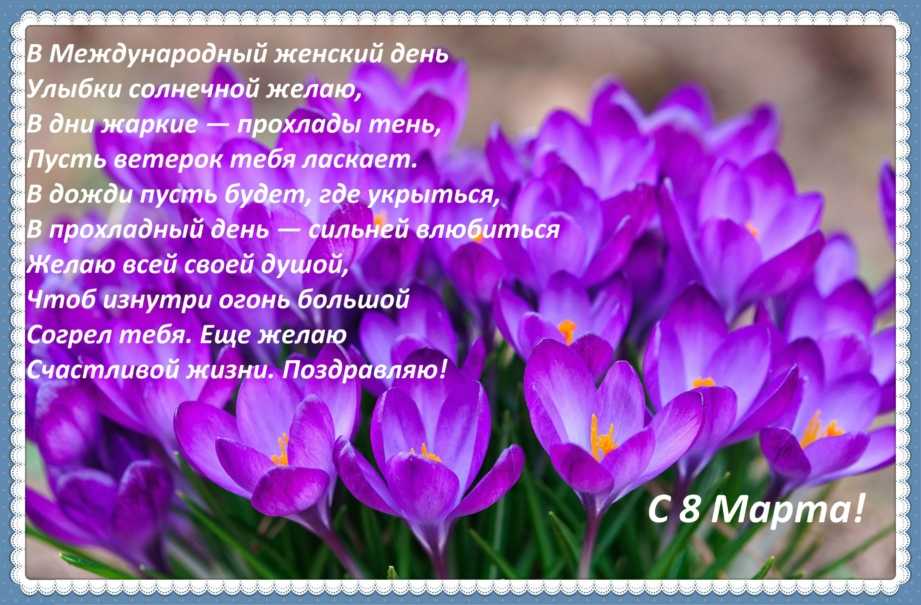 Мартовская открытка с фиолетовыми цветами и стихами на их фоне.