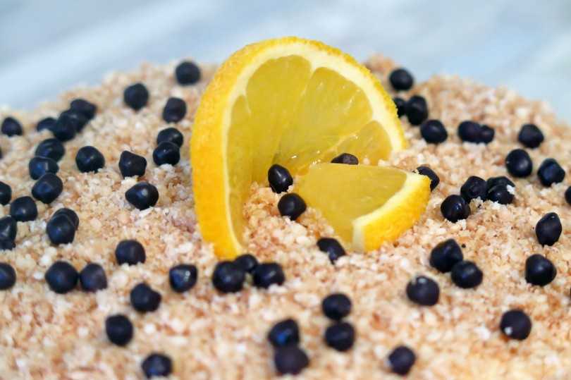 - Промазать кремом и сливовым вареньем, собрать торт. Вместо сливового варенья, можно взять любой другой джем. Обмазать верх. Украсить торт на юбилей женщине кондитерскими украшениями и веточками мяты.