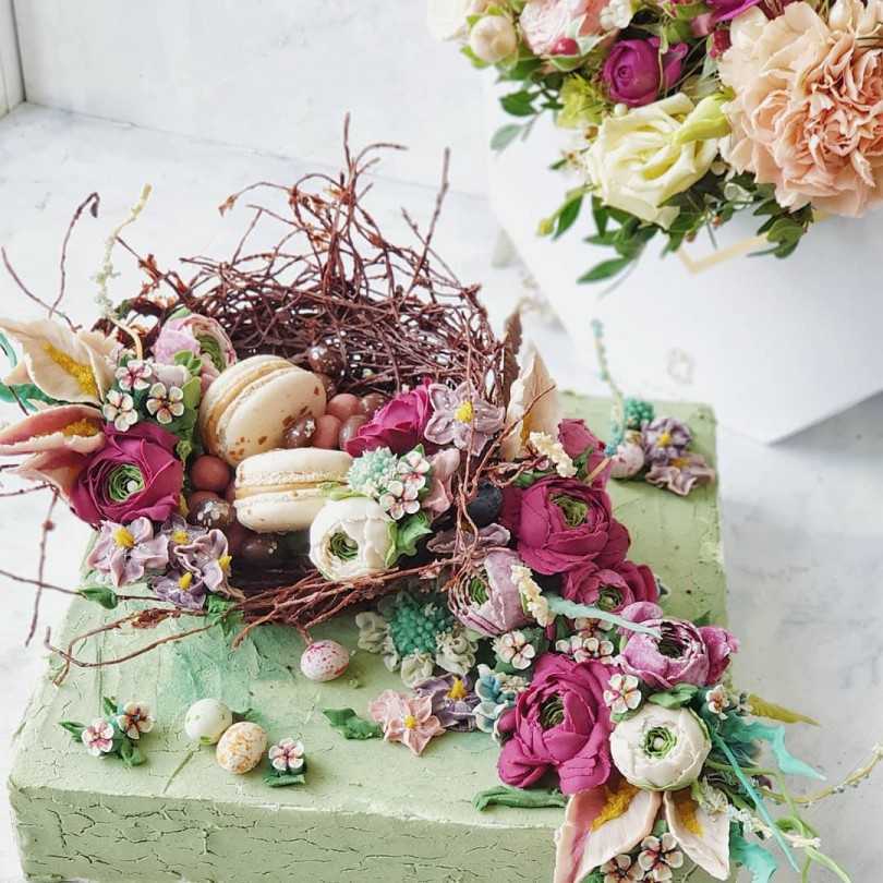 Нежное цветочное зеленое или бежевое оформление торта при помощи цветочного узора подчеркнет элегантность и изящество вашего наряда, а также эстетичное убранство праздничного стола.