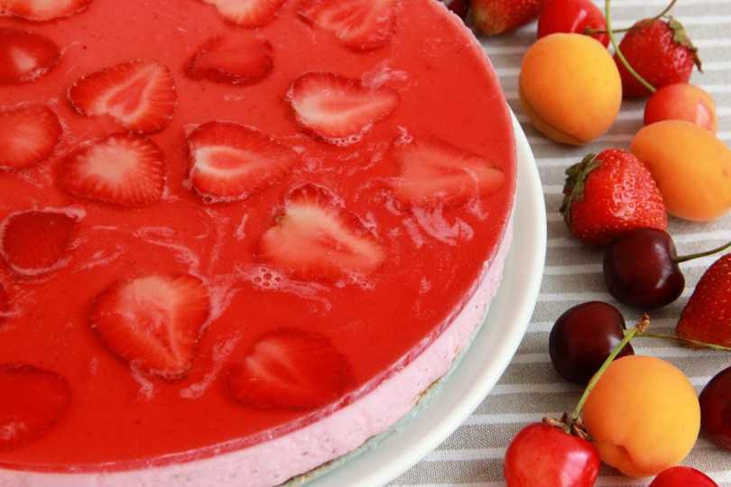 Для тортов без выпечки используют клубнику в желе. Её можно оставить целой или разрезать на пластинки, красиво уложить и залить желе (заливать необходимо в форме).