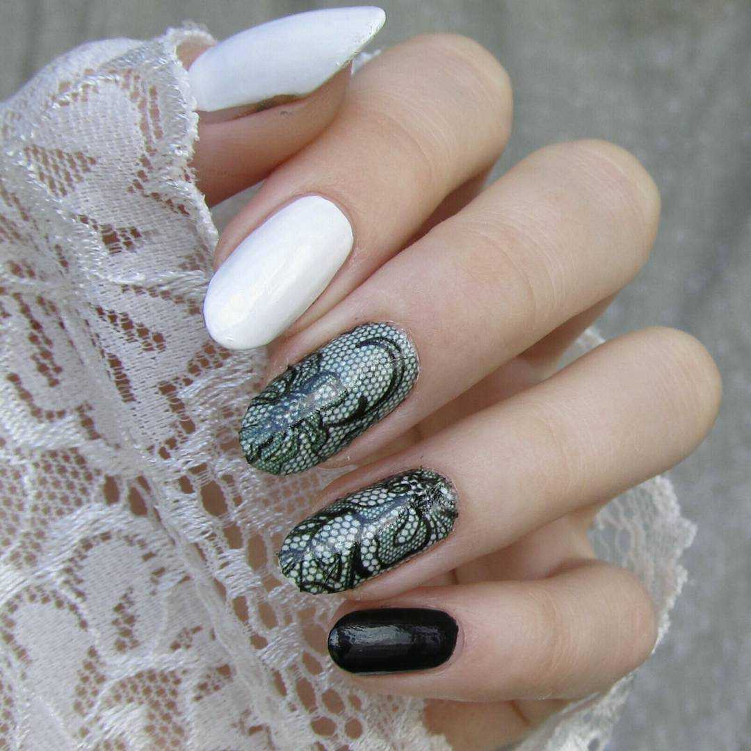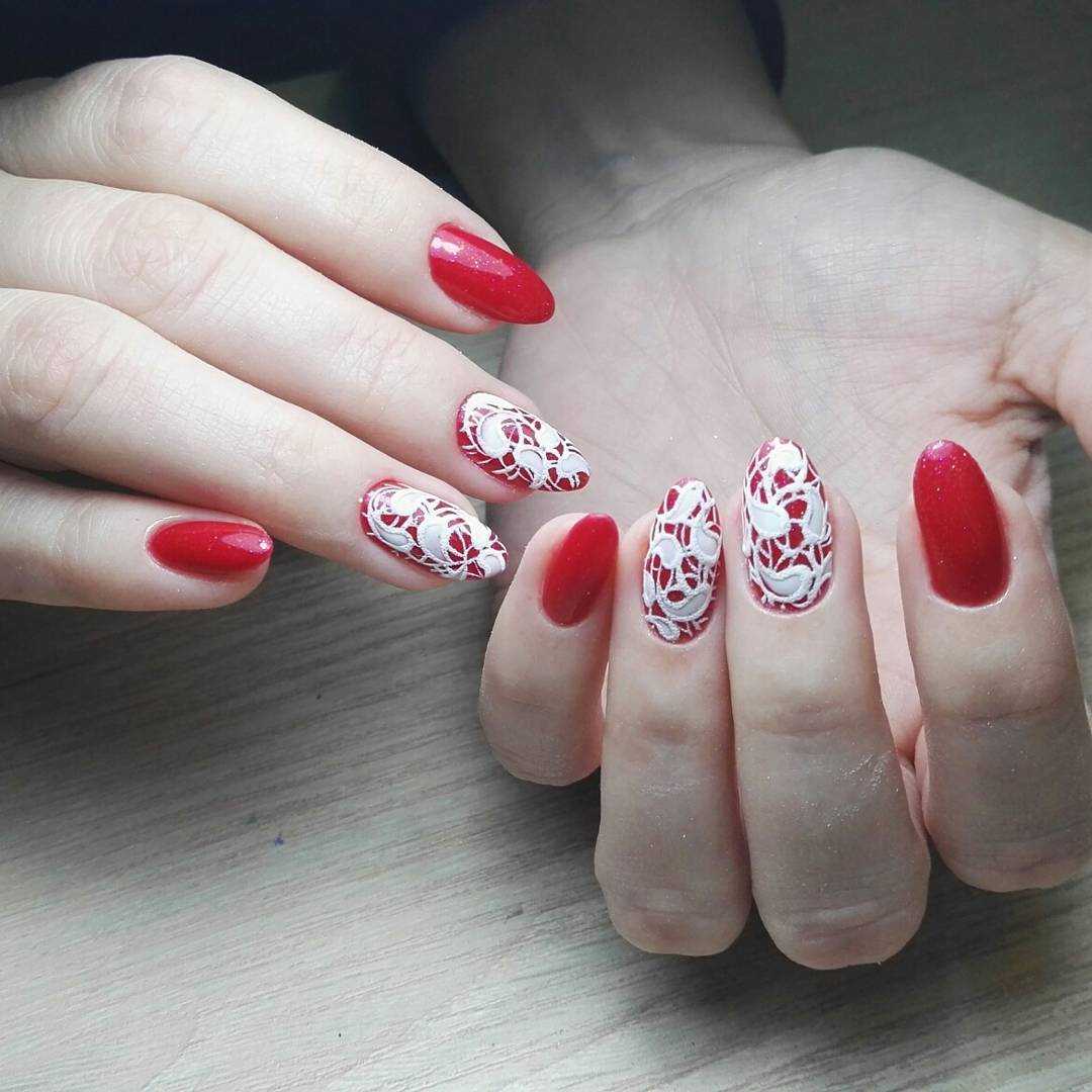 Пожалуй, самый нежный вариант оформления ваших ноготков. Полупрозрачная кружевная вуаль великолепно выглядит на романтичном нюдовом фоне. Единственная проблема состоит в том, что подобный декор не уместен на очень короткие ногти.