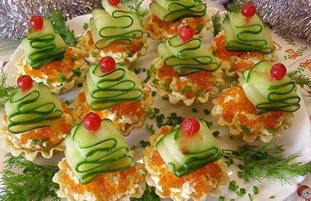 - Выложите на верхушки красную икру и украсьте огуречными елочными фигурками. Можно добавить ягоды, зеленый лук или веточку укропа.