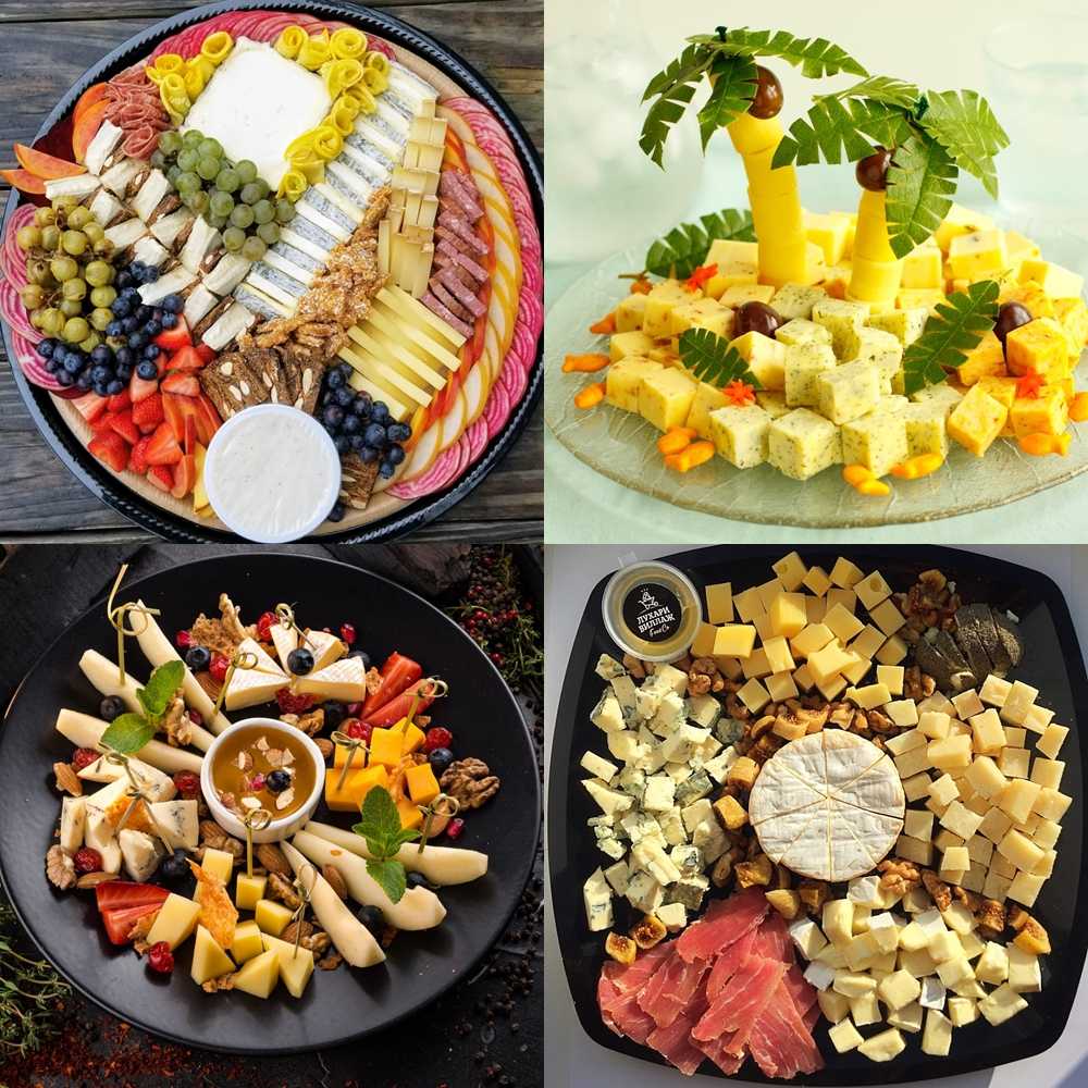 Рекомендуется использовать сразу несколько видов сыра – не менее 5, плавленые и кремовые сырные пасты при этом не используются. Нарезать его можно брусками, пластинами, кусочками, ломтиками, слайсами или различными фигурками.