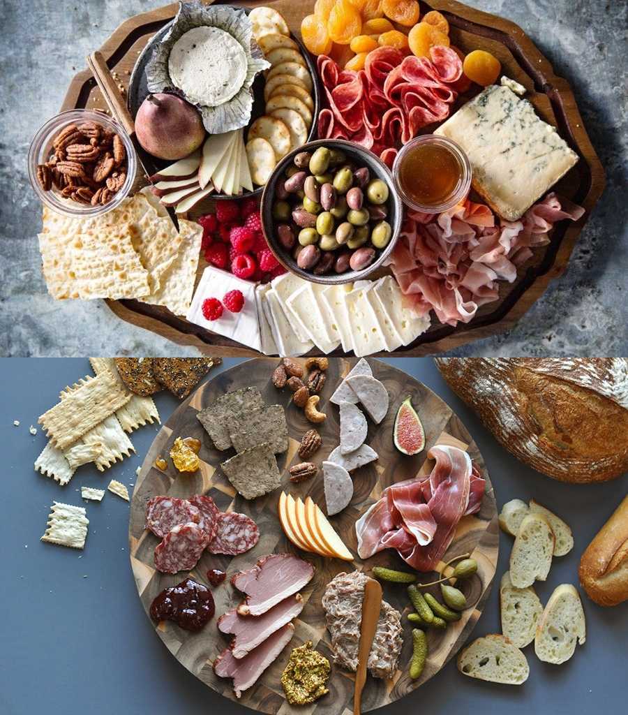 Отличной идеей будет поставить на сырную доску емкость с натуральным медом, джемом или вареньем, как на фото-коллаже.