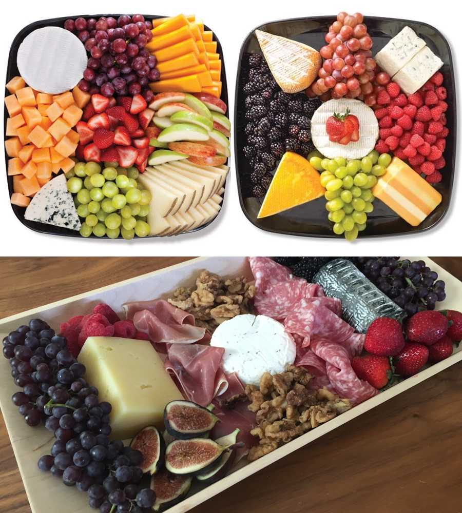 Добавляют в сырную тарелку обычно ягоды, орехи, фрукты и сухофрукты: курагу, чернослив, финики, изюм, инжир, виноград, груши, апельсины, яблоки, бананы, клубнику, чернику, миндаль, грецкий орех, арахис, фисташки, кешью, кедровые орешки, макадамия, фундук, пекан и т. д.).