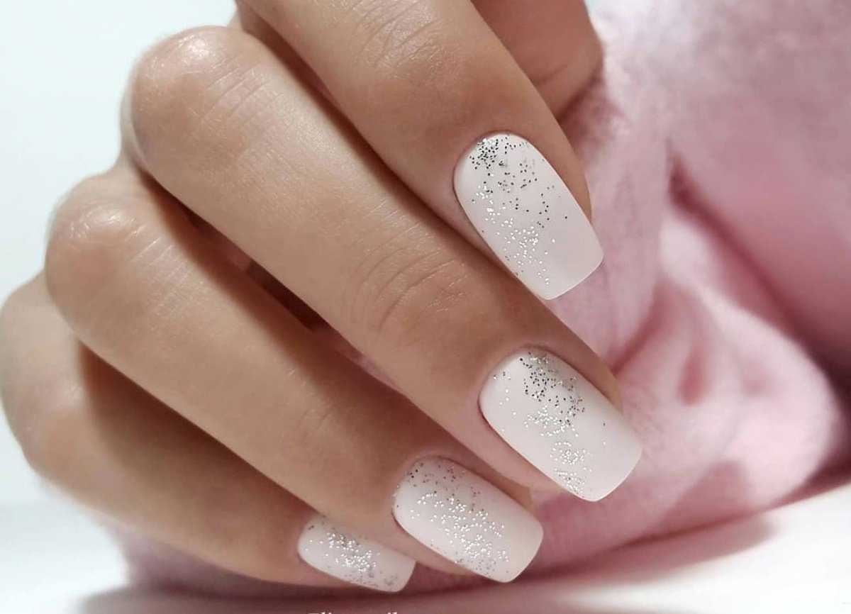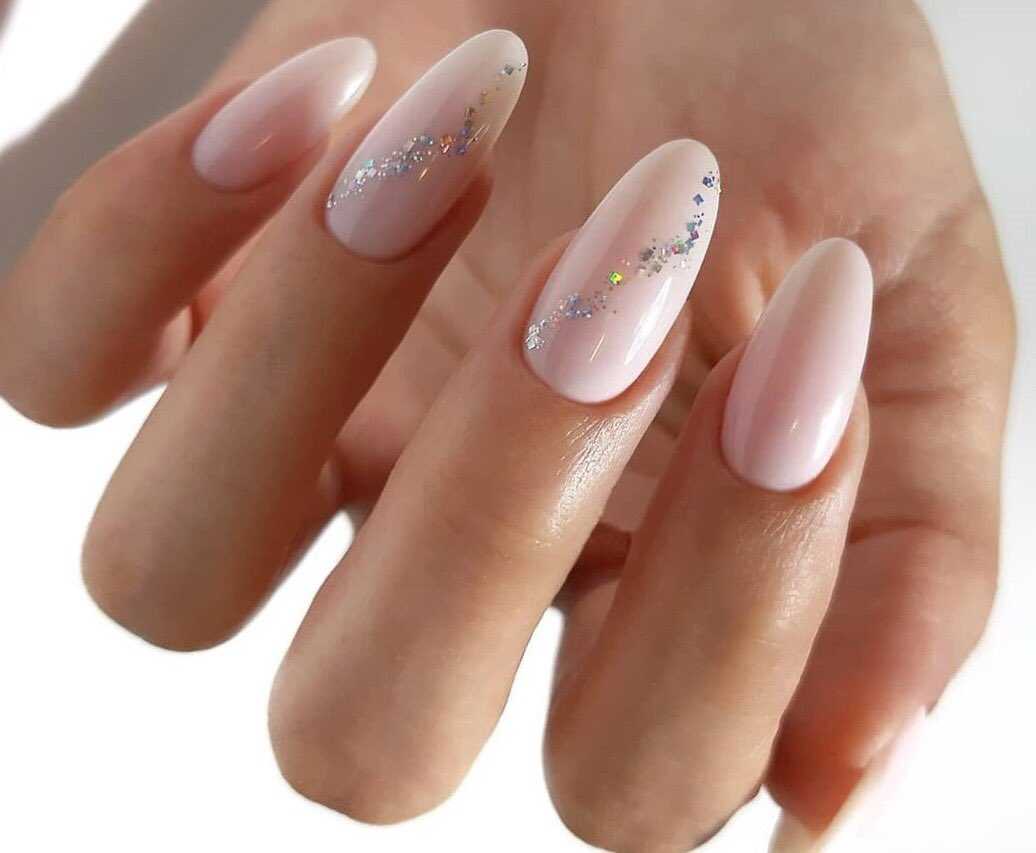 Все также актуальной остается тема молочного маникюра с блестками. Такой вариант дизайна ноготков чаще всего выполняется для особенного торжества.