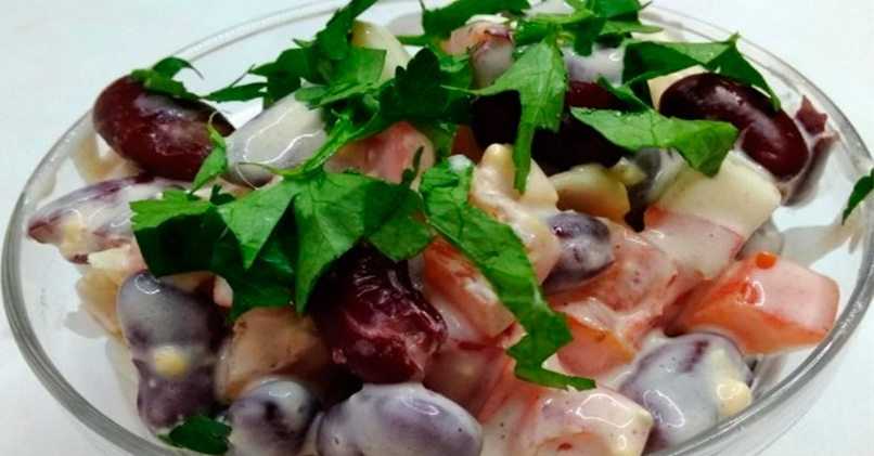 Вот точно знаю – чем проще блюдо, тем оно вкуснее. Разумеется, при условии выбора правильных продуктов. Возьмите помидоры подороже, чтобы они не были “стеклянными”, фасоль можно сварить самому или использовать консервированную, предварительно слив жидкость, и обязательно добавьте вареное яйцо для мягкости и насыщенности. Советую заправить закуску легким майонезом, так она будет аппетитнее.