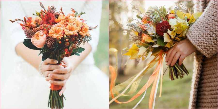 Ноябрьский букет невесты должен состоять из цветов ярких оттенков. Чтобы составить сезонную композицию, используйте астры, фрезии, герберы. Часто осенние букеты украшают декоративными шишками, небольшими веточками рябины, искусственными листьями.
