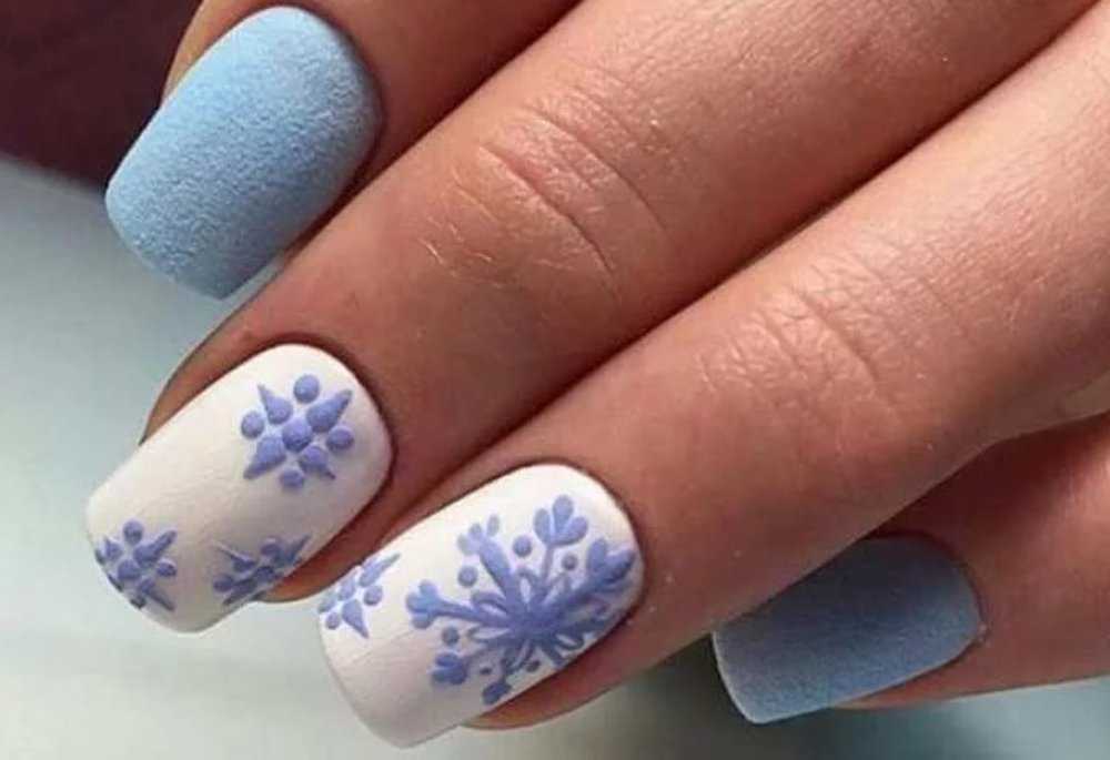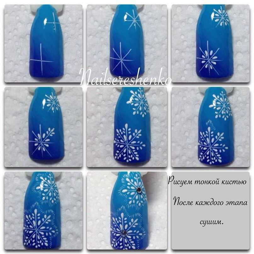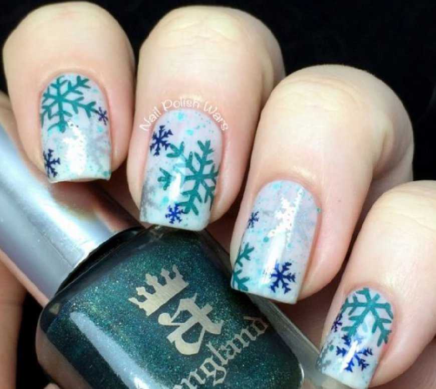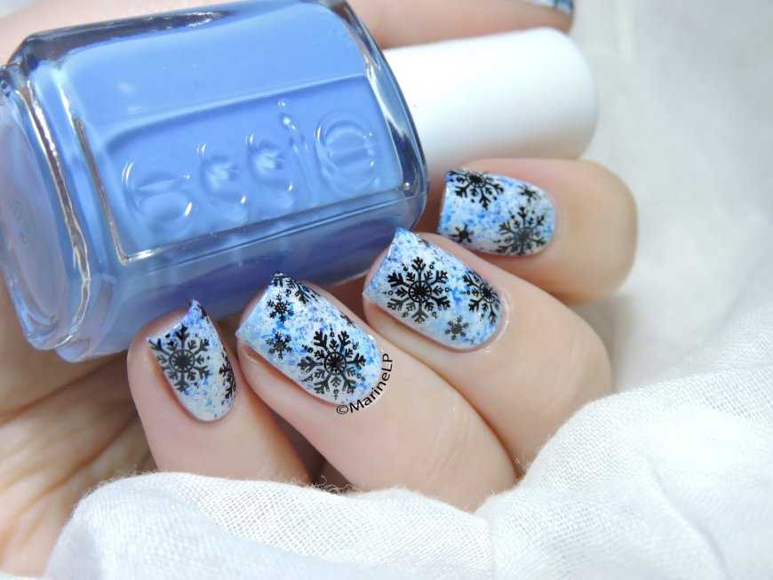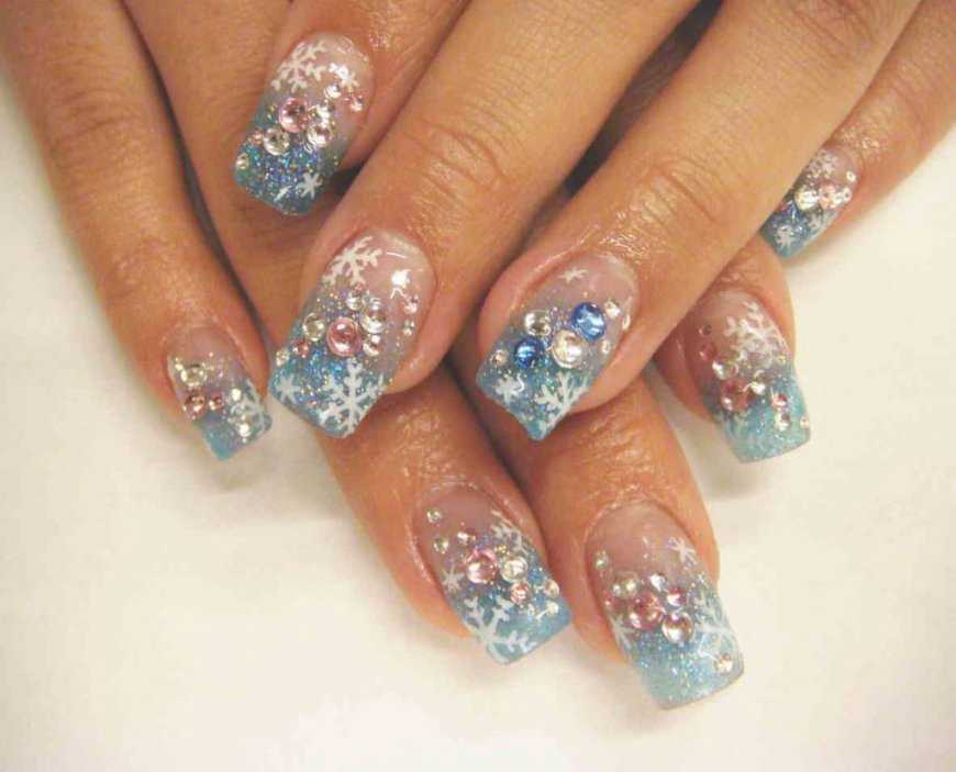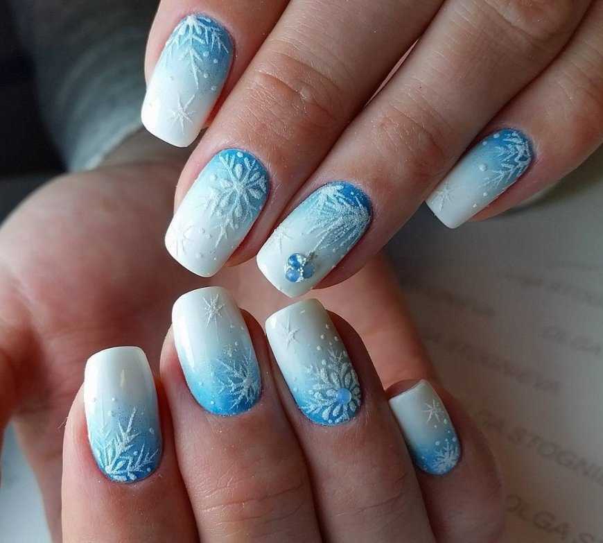 Хорошо будет смотреться на ледяном омбре множество снежинок, выполненных более контрастным цветом нежели фон.