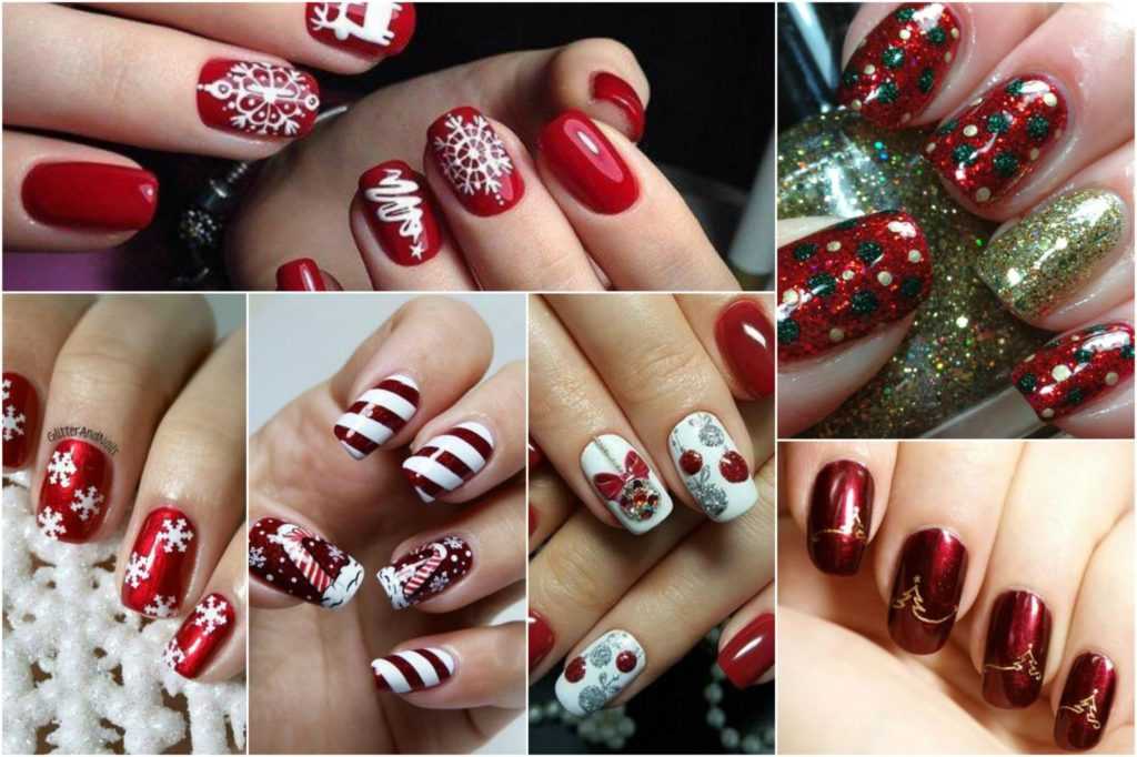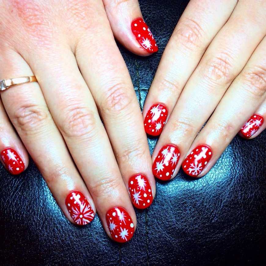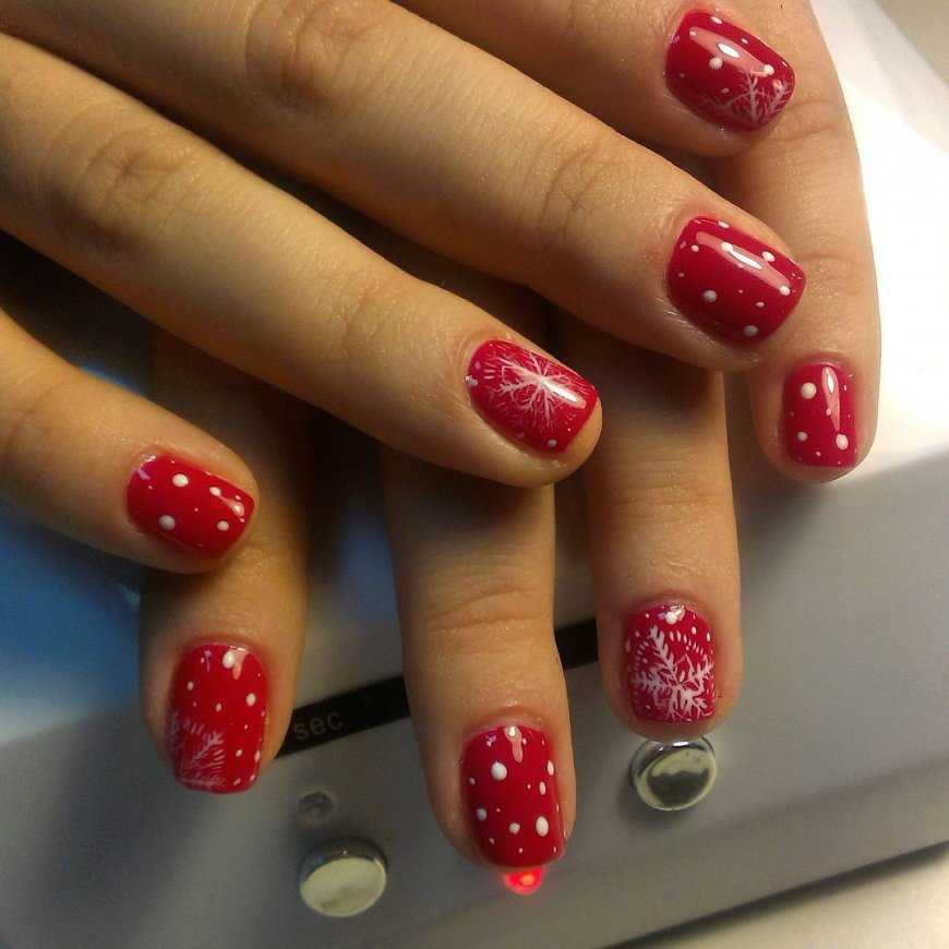 Интересным решением будет френч, серебряный или золотой декор, комбинация с геометрическим или звериным узором. Особенно эффектен на красном поле объемный рисунок на зимнюю тему.