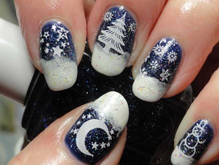 Чтобы добиться зимнего ледяного эффекта, который великолепно подходит в зимнее время года, следует использовать холодные цвета лаков. В маникюре допускается применение блёсток и перехода цветов, выполнение которых, делается при помощи аэрографа.