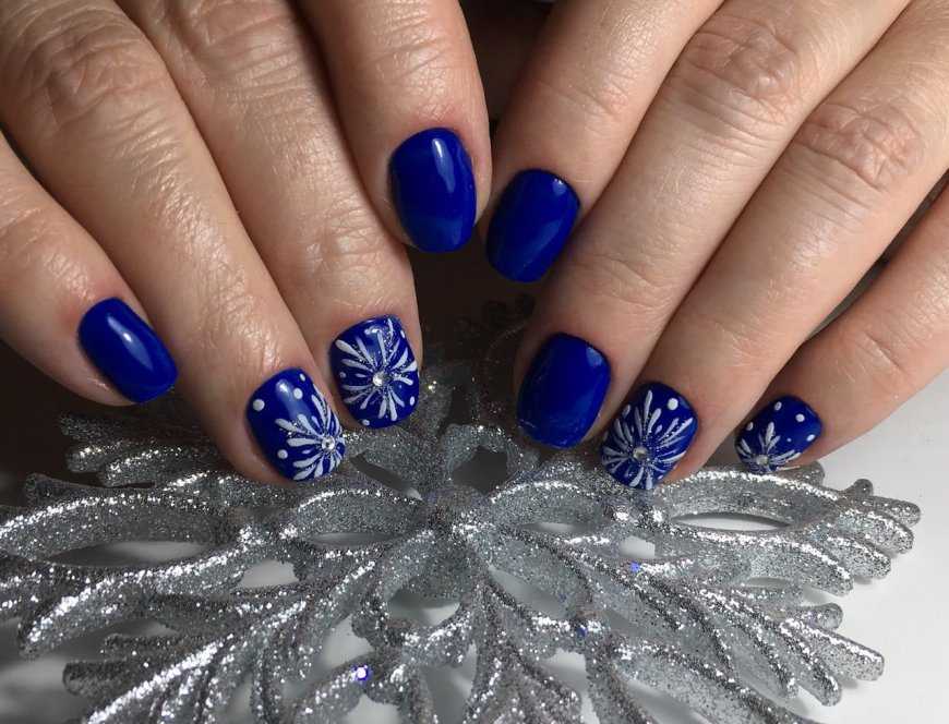 Насыщенный и яркий синий символичен для новогоднего праздника. Цвет органичен на длинных и коротких ногтях. Нарядности добавит серебряная или золотая втирка. По-зимнему выглядят на синем фоне белые узоры, разводы, напоминающие вьюгу.