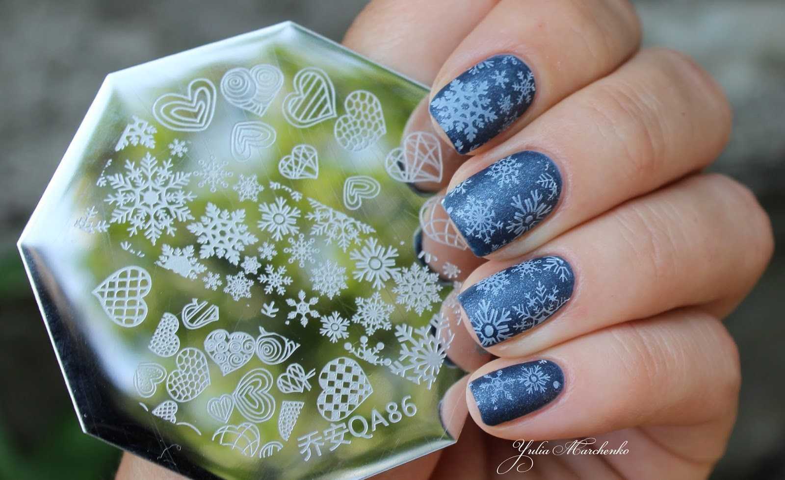 Специальные шаблоны на металлических пластинах — спасение для тех, кто не доверяет своим художественным навыкам. Техника нанесения довольно проста, но придется приобрести еще и скребок, силиконовый штамп. Кроме того, не забывайте просушить рисунок перед тем, как нанести закрепитель.