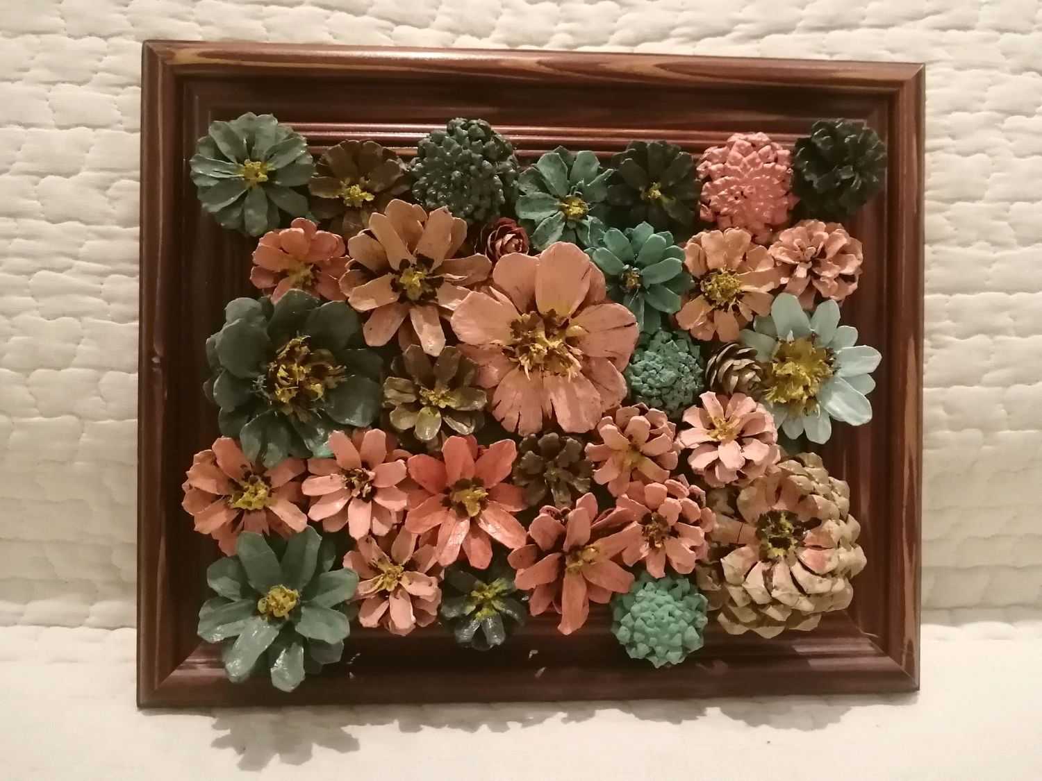 Оригинальное панно из цветных шишек станет изюминкой любого помещения. Им можно украсить кухню, уголок отдыха, спальню… Да и ухаживать за таким изделием совсем несложно. Всего лишь – прохолаживаться во время уборки метелочкой для пыли. Эта красота будет радовать вас круглый год!