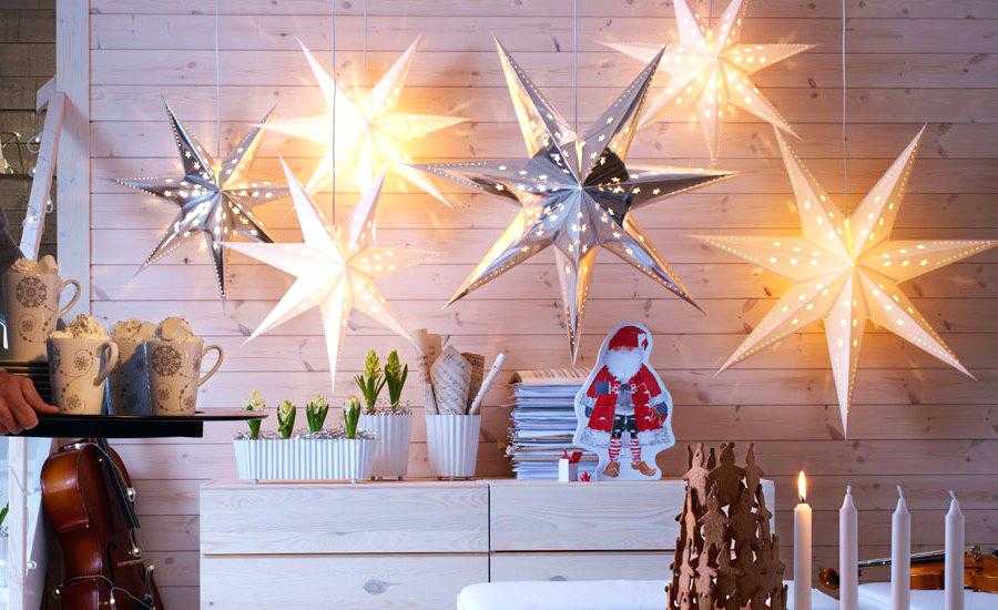 Провода и крепления герметичны, поэтому не боятся непогоды и осадков. Гирлянды могут быть выполнены в виде цветков, шаров, елочек, сердец и других форм. Некоторые модели работают от солнечных батарей. Например, уличные светильники в течении дня накапливают солнечную энергию, а с наступлением сумерек красиво мерцают. Рождественские венки украсят не только фасад дома, но и стены в квартире. Если во дворе растет елочка, то ее можно украсить рождественской звездой, которую предлагает магазин Икеа.