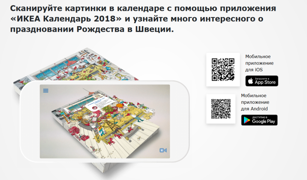 Также, в 2018 году создано приложение «Рождественский календарь ИКЕА» где вы найдете советы по изготовлению интересных поделок и подготовке к празднику, а также рецепты вкусных блюд и описание шведских традиций. Скачайте приложение на свое мобильное устройство, сканируйте лицевую сторону календаря и его окошки с внутренней стороны — и наслаждайтесь волшебным миром шведского Рождества.