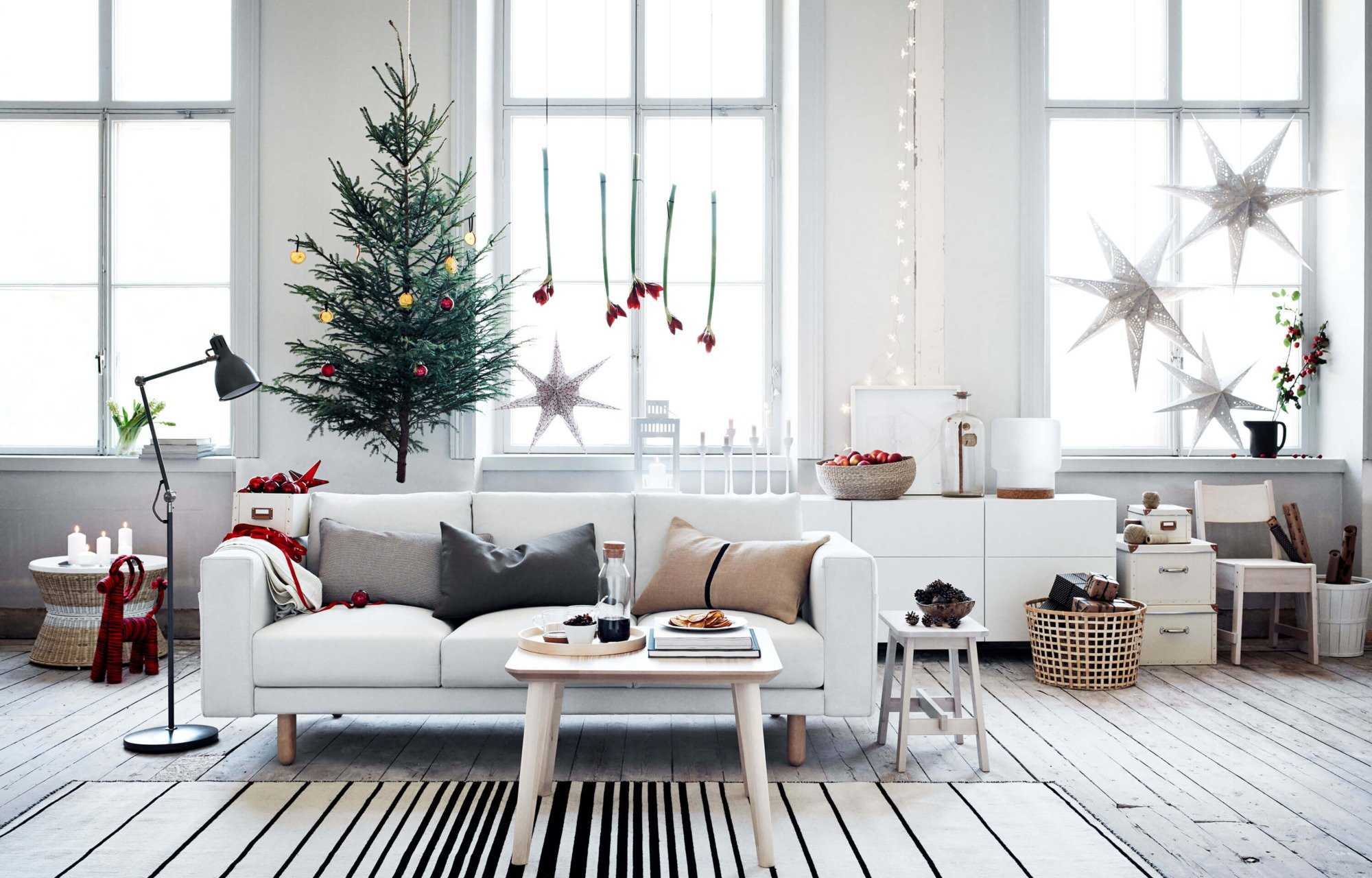 - Минимум елочных игрушек. Если все-таки принято решение установить елку, то акцент делается именно на хвое. На елку достаточно повесить несколько шариков и разместить небольшую гирлянду.