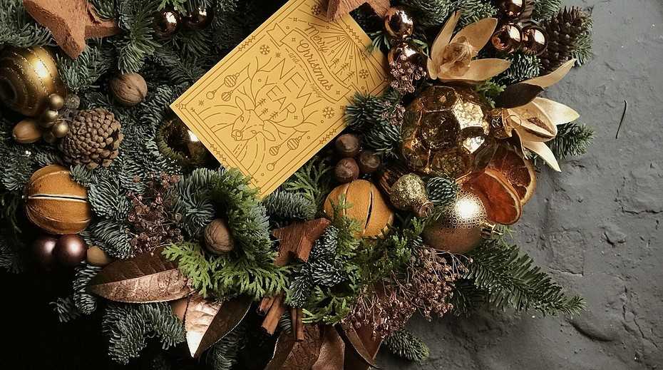 - Еловый венок. Стилизовать этот предмет можно в разном ключе. К примеру, вместо традиционного пестрого венка, можно выбрать более сдержанный вариант, который идеально подойдет под стиль квартиры.