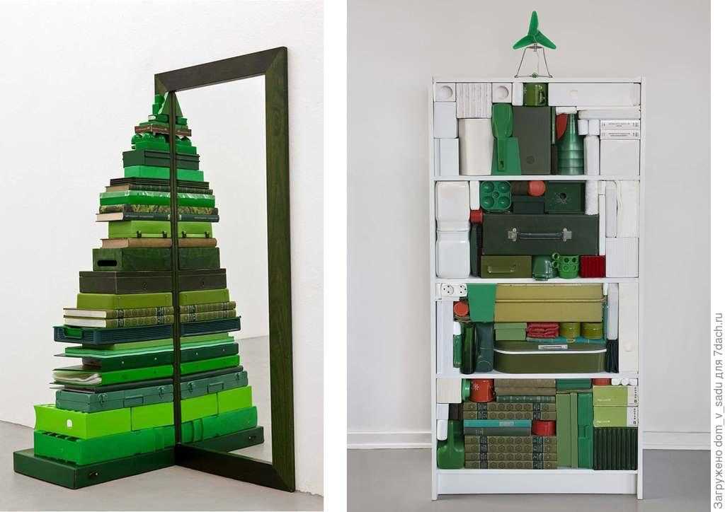 В каждом доме найдется зеркало, открытые стеллажи или полки. Так почему бы не использовать их для создания оригинальных новогодних красавиц? Для этого вам придется отобрать зеленые предметы и выложить из них форму ели. В варианте с зеркалом задача упрощается, ведь создается только одно «крыло» деревца, другое — просто отражается. Оптический эффект играет вам на руку.