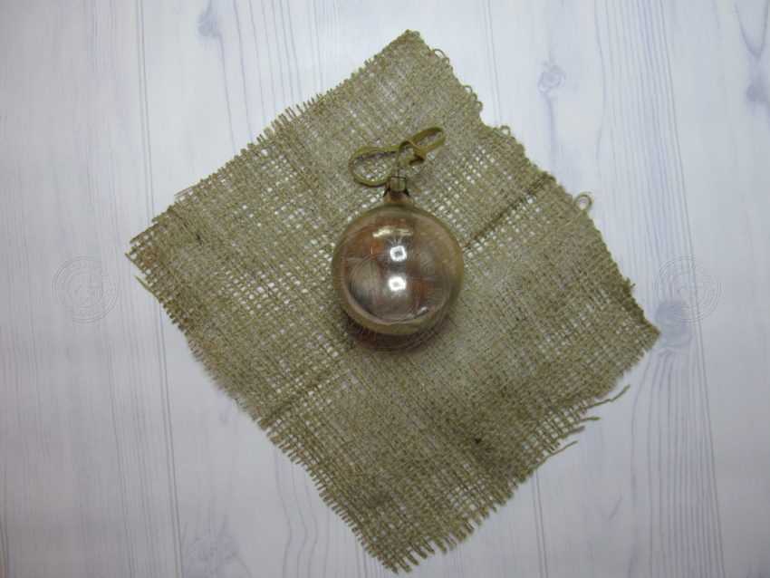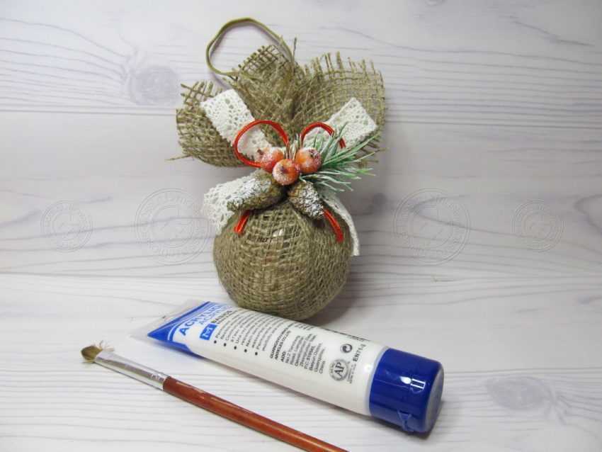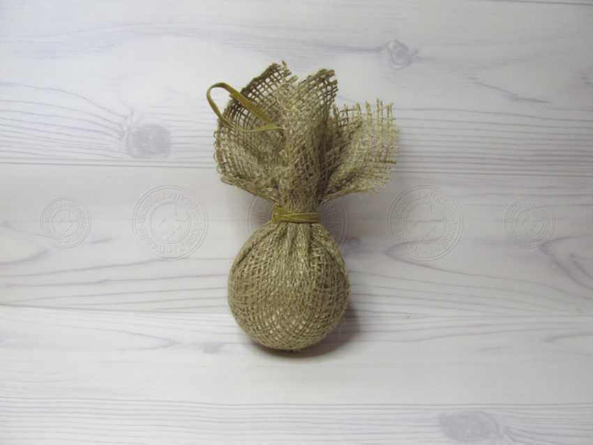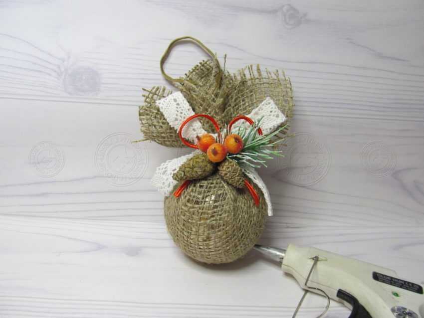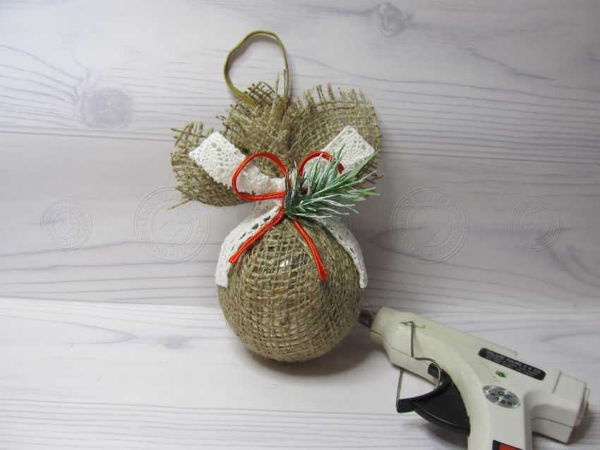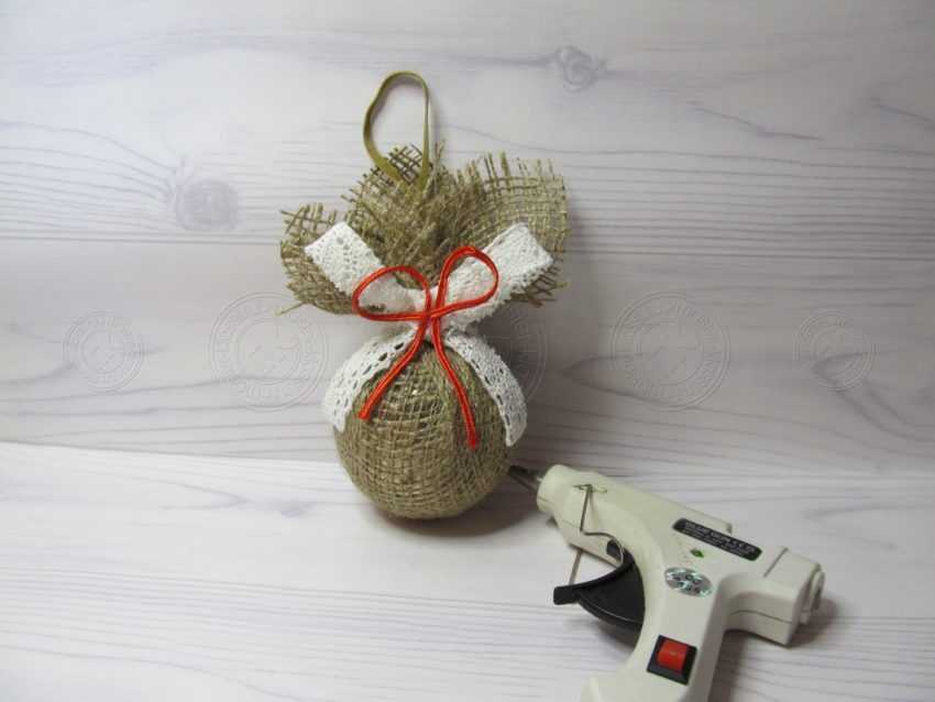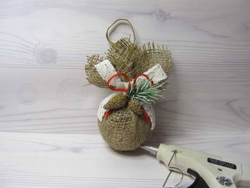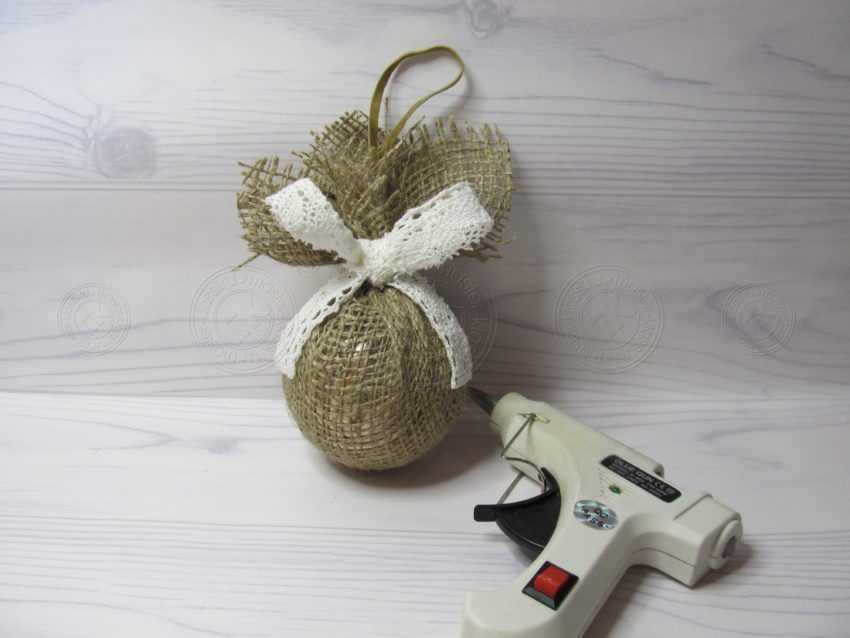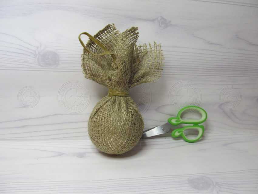 4. Обматываем шар мешковиной и перевязываем тесьмой, точно такой же, какая у нас была закреплена на игрушке.