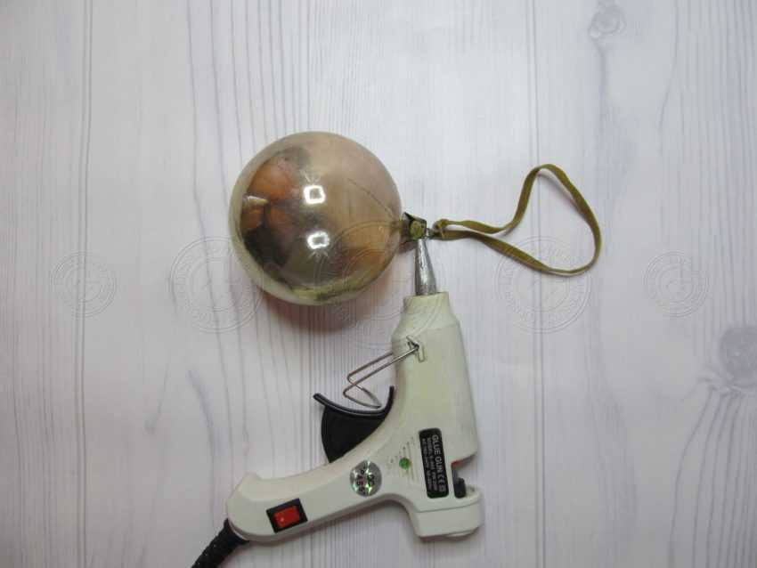 7. Используя клеевой пистолет посетите шар на игрушку. Подержите какое-то время всю конструкцию в руках, чтобы раствор остыл и схватился.