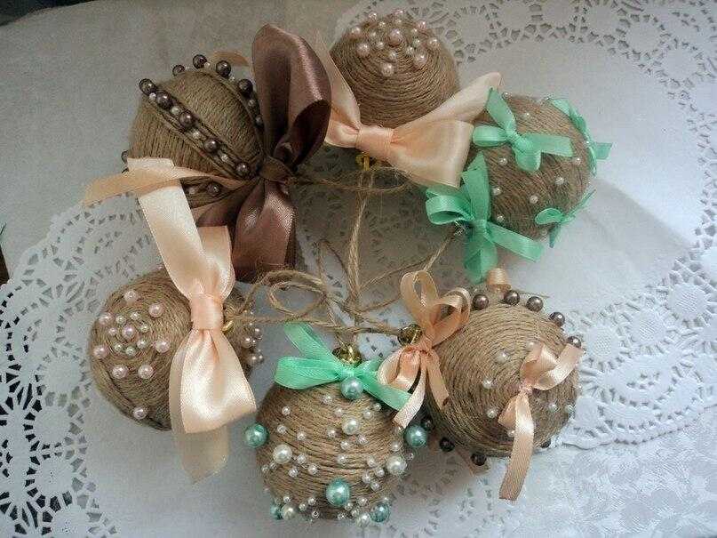 Начнём с обзора различных вариантов ёлочных игрушек и прочего декора из шпагата.