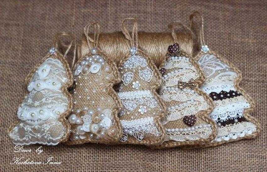Дополнительно украсить елочные игрушки из мешковины и добавить им нежности и невесомости, можно с помощью тонкого кружева (так же, аккуратно приклеив его к поверхности мешковины). Для надежности и дополнительного декора, каждую игрушку по краю можно прошить «обметочным» швом с бисером или мелкими бусинами.