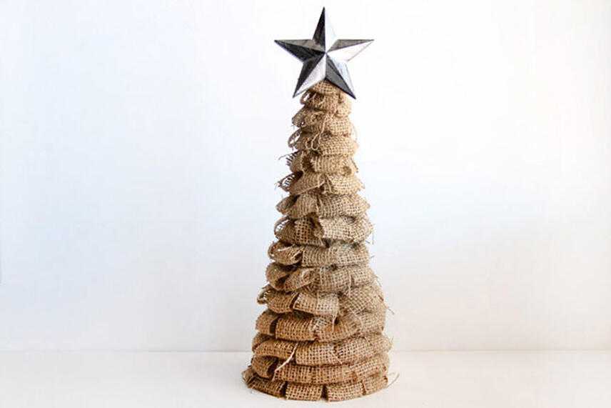 Используя конус из картона в качестве основы, нетрудно смастерить интересную елочку. Конус потребуется оклеить мешковиной, а затем украсить стеклянными бусинами, блестящими пуговицами, кружевом или тесьмой.
