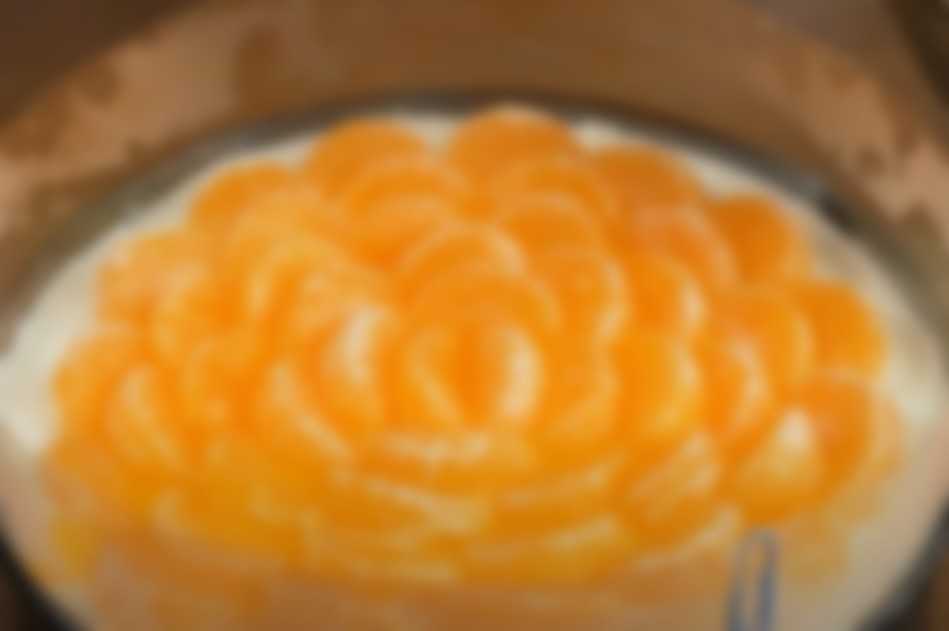 На застывший крем по кругу выкладываем дольки мандаринов, имитируя цветок.