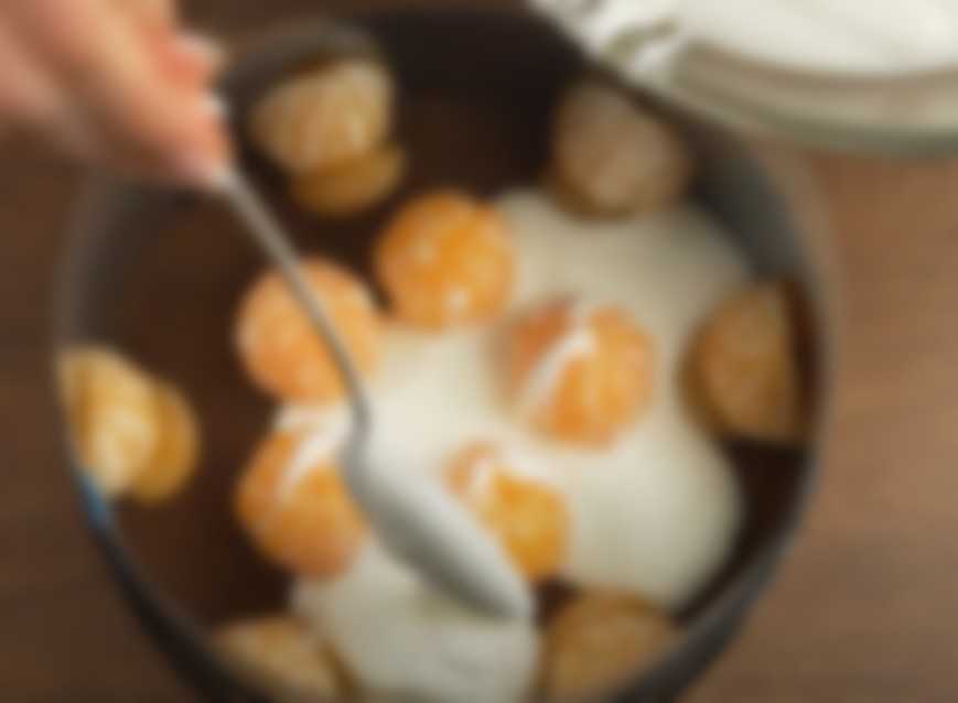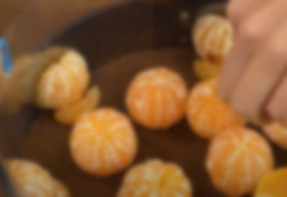 - Мандарины чистим от кожуры и белых пленок. Три фрукта делим на три части, пять оставляем целыми, а остальные разбираем на отдельные дольки.