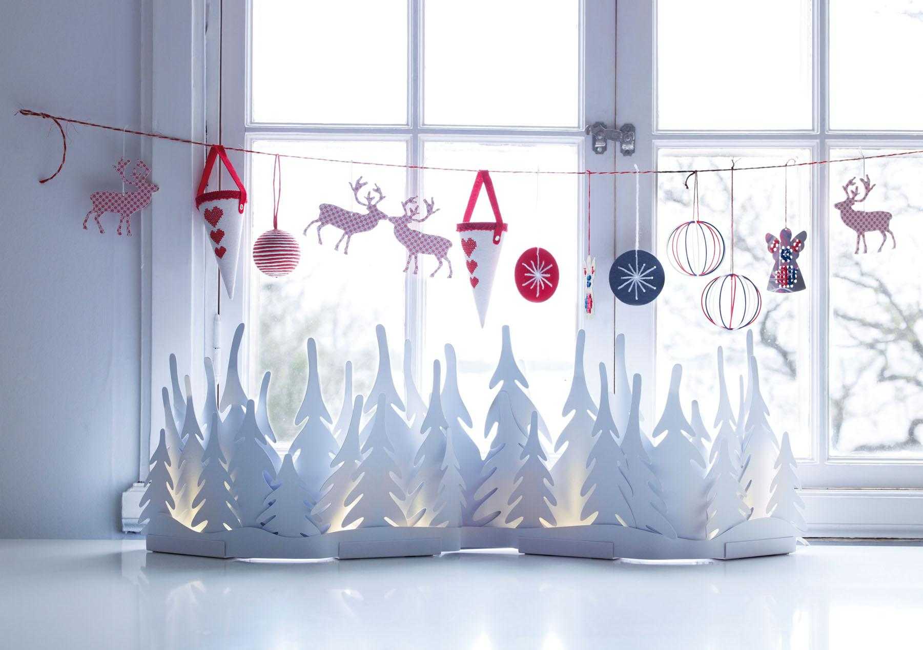 Самый бюджетный вариант – декорирование потолка при помощи вырезанных фигурок снежинок, ангелов, звездочек, елочек. Каждую фигурку можно вырезать по отдельности, а затем просто скрепить в одну ленту. Фиксировать самодельный декор также поможет двухсторонний скотч. При этом, потребуется самая простая бумага – от излишне ярких и фактурных материалов можно отказаться.