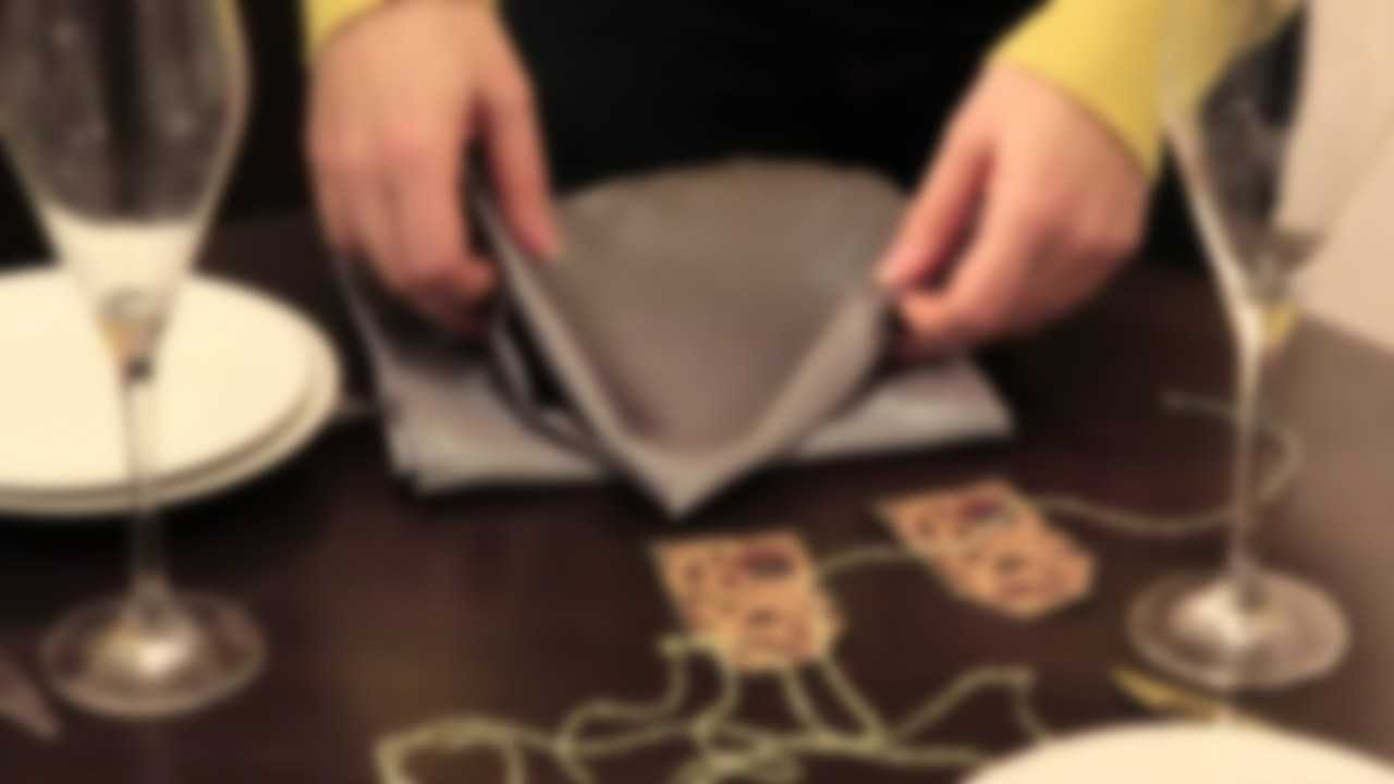 Затем на каждый комплект можно разложить салфетки. Если они тканевые, то их ставят или кладут прямо на тарелку. Бумажные стоит положить рядом, только один краешек нужно обязательно спрятать под тарелку. Если за столом соберется большая компания, то можно ограничиться оригинальной салфетницей.