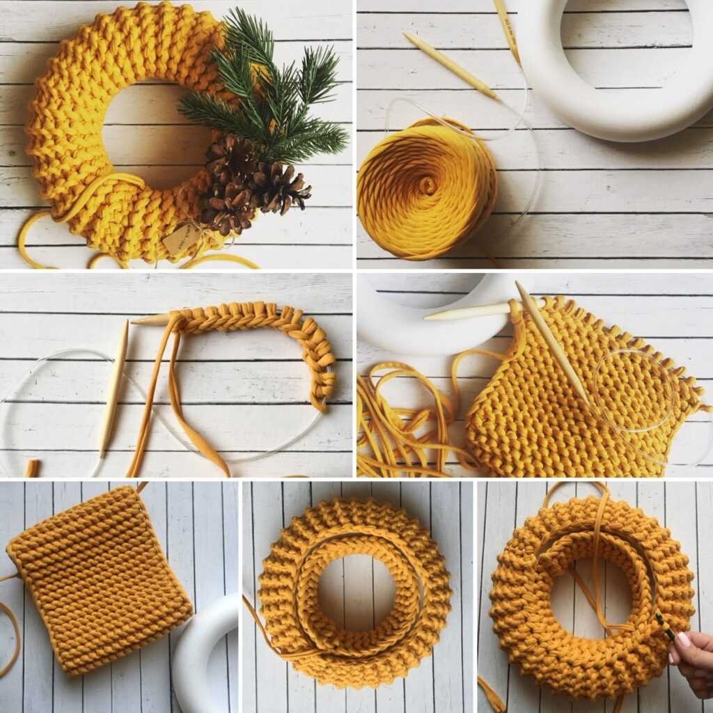 Оригинально будет смотреться венок, элементы которого связаны крючком из толстой зеленой буклированной шерстяной нити. На такой венок можно подвесить несколько мелких фигурок амигуруми, приклеить блестки и конфетти, а также прикрепить имитирующую снег вату. Схемы и описания подобных вязаных изделий можно найти далее на фото.