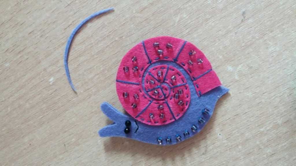 Остается слегка набить улитку ватой, она должна быть немного выпуклой; присоединить булавку с обратной стороны и брошка-улитка считается готовой. Такое украшение станет отличным подарком для дочки.