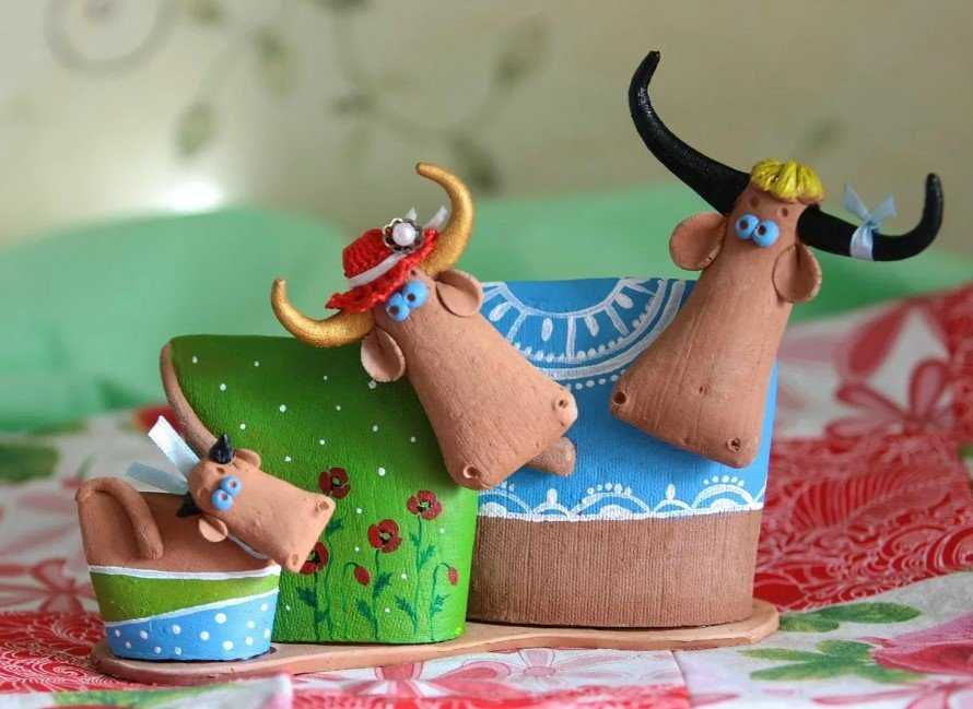 Способ изготовления таких поделок аналогичен способу лепки из пластилина или полимерной глины. Для закрепления процесса, фигурки Быка или забавной коровы следует хорошо просушить при температуре 50-150 градусов в течение получаса-часа. В этом случае всё зависит от размеров вашей поделки. Остаётся разукрасить новогоднего символа яркими красками и шедевр готов!