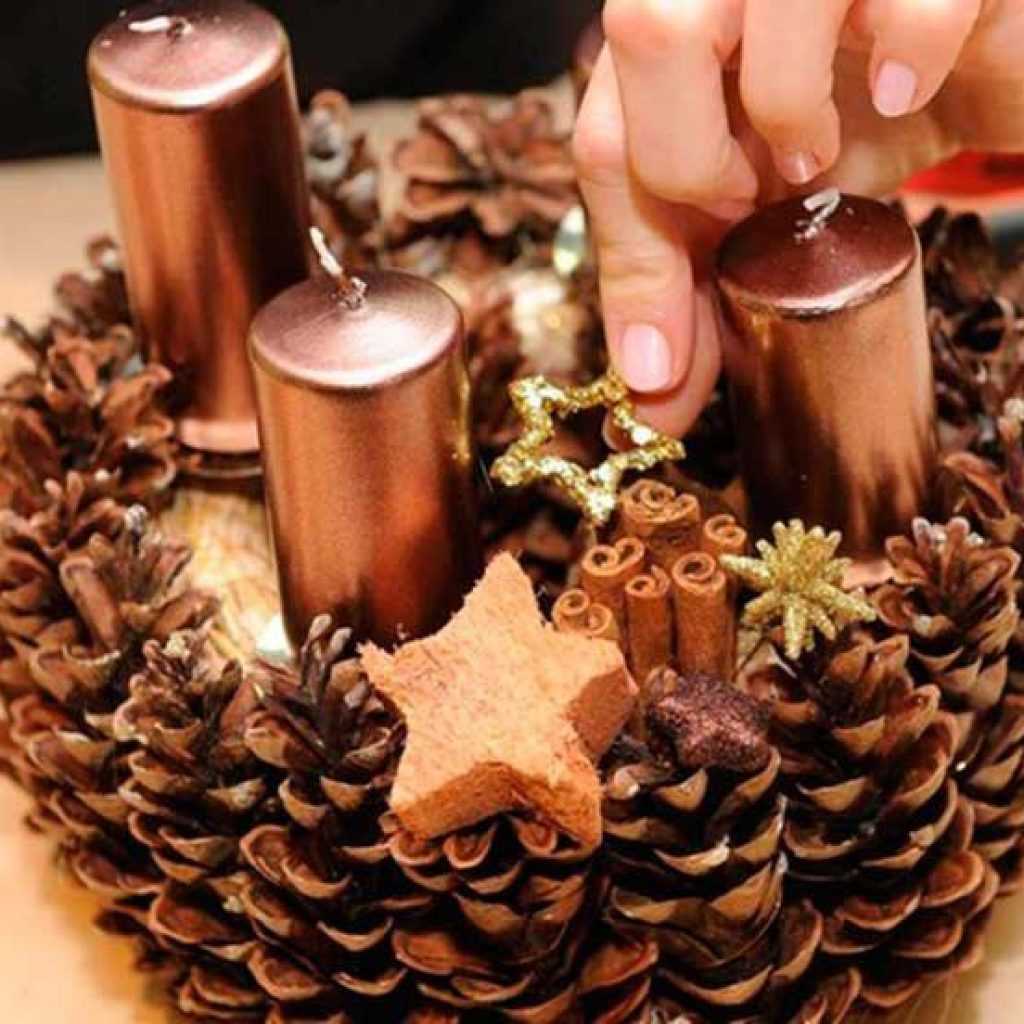 На первой стадии стоит вырезать из картона круг диаметром 20 см, а внутри него еще один круг диаметром 10 см. При помощи клея приклеить шишки на вырезанный картон, а между ними приклеить скорлупу от орехов. Получившуюся композицию стоит покрыть зелёной краской и дождаться пока высохнет. К шишкам приклеить бусинки. Далее следует сделать из проволоки круг диаметром 10 см и обклеить его золотистыми бусинками. Наш подсвечник готов, осталось только взять свечу и поставить её во внутрь и зажечь.