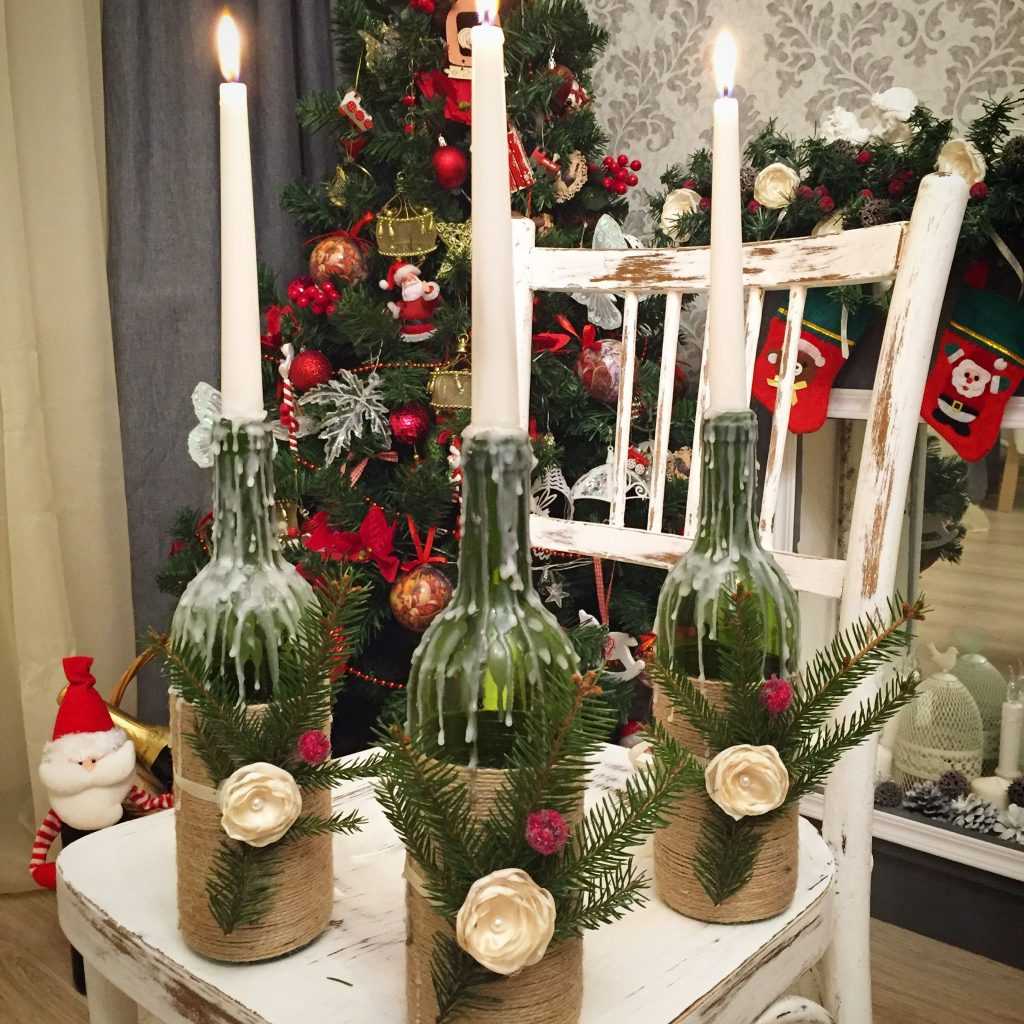 Симпатичными украшениями станут простые подсвечники, сделанные из небольших стеклянных банок, стаканов. Для этого их бока расписываются красками.
