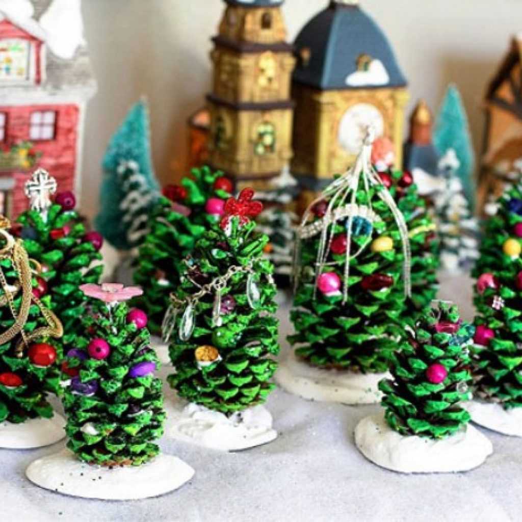 В елочку можно превратить и отдельную шишку, если покрасить и декорировать бусинами. Эффектнее на выставке или конкурсе детского творчества будет смотреться большая елка из сосновых шишек.