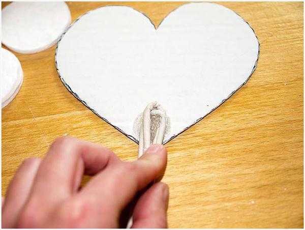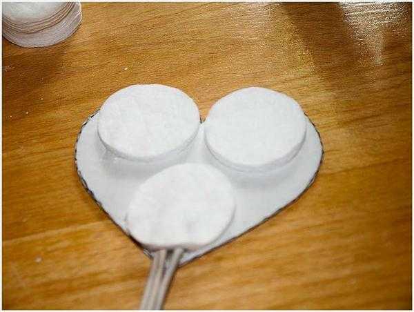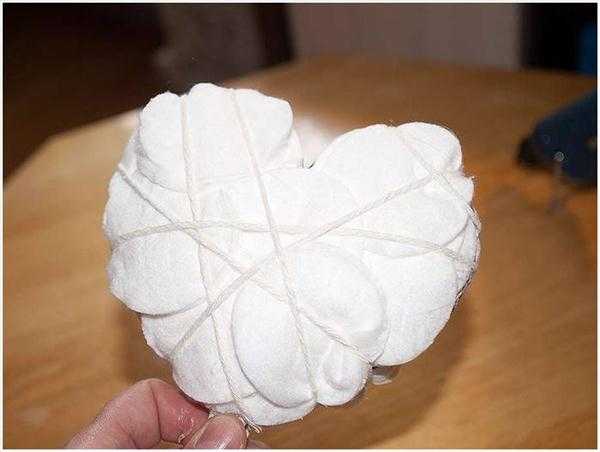 Приклеиваем сверху вторую заготовку из картона. Полученное сердце обклеиваем большим количеством ватных дисков, чтобы оно приобрело пышную форму, после чего обматываем фигуру веревкой.