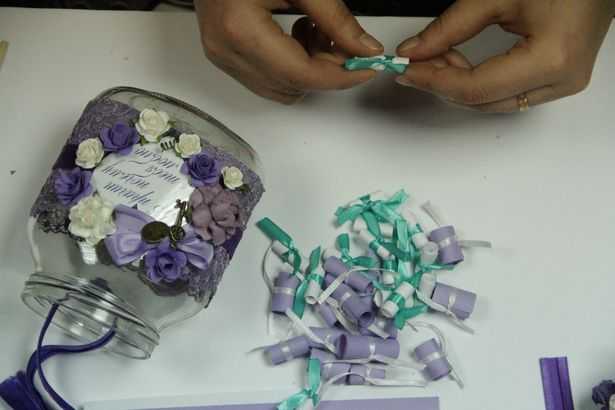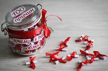 Признания в любви можно писать от руки или напечатать текст на компьютере. Оформленные записочки складываем в прозрачную банку, на которую приклеиваем надпись «50 причин, почему я тебя люблю». Банку с признаниями украшаем кружевом или декоративной лентой.