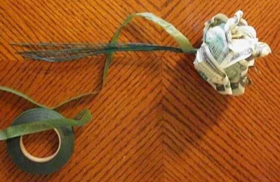 Надеваем заготовленные купюры на проволоку, скручивая концы, чтобы банкноты крепко держалась.